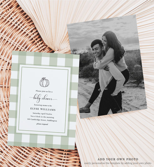 Gingham Sage Green Pumpkin | Printable Baby Shower Invitation Suite Template