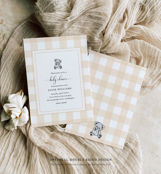 Gingham Tan Bear | Printable Baby Shower Invitation Template