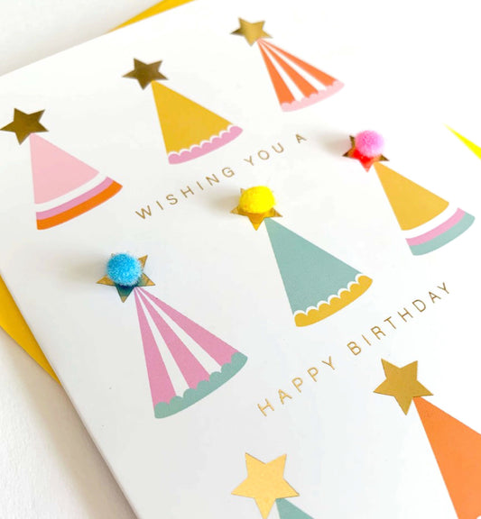 Party Hat Pom Poms Multi Gold Birthday Greeting Card
