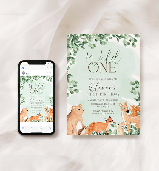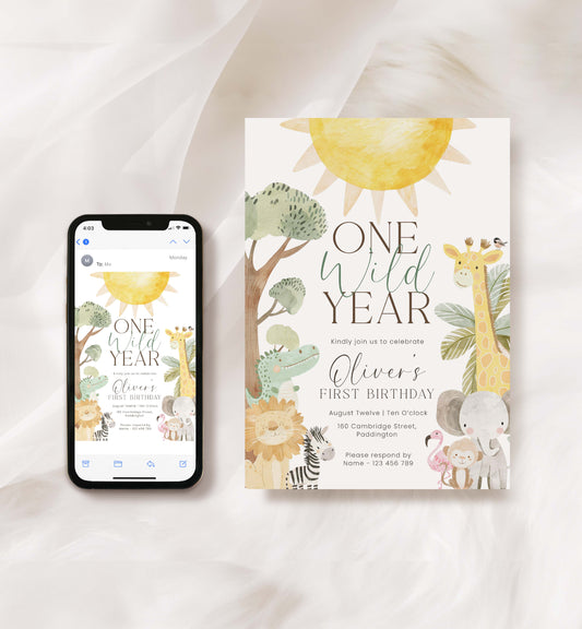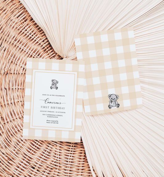 Gingham Tan Teddy Bear | Printable First Birthday Invitation Template