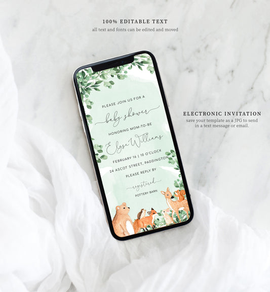 Woodland Animals Green | Smartphone Baby Shower Invitation Template