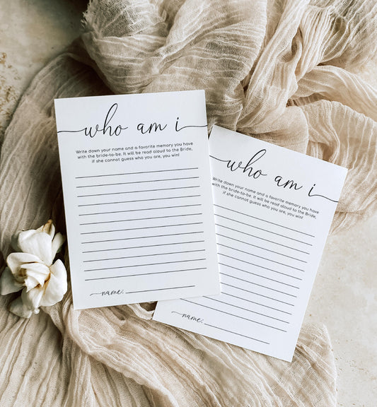 Quinn Script White | Printable Who Am I Bridal Shower Game