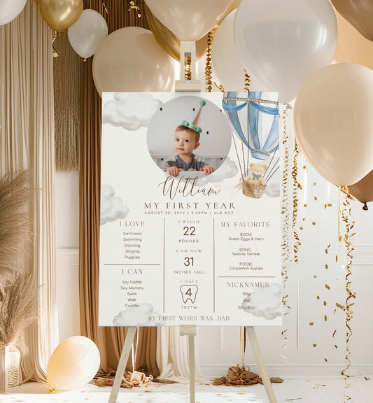 Beary First Blue | Printable First Birthday Milestone Sign Template