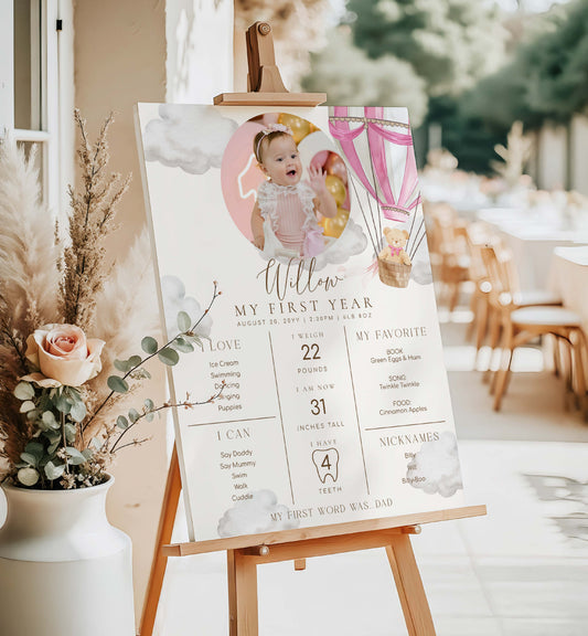 Beary First Pink | Printable My First Year Photo Timeline Sign Template