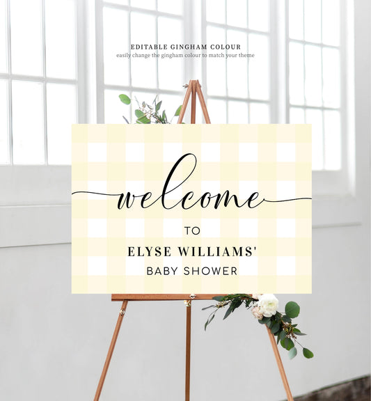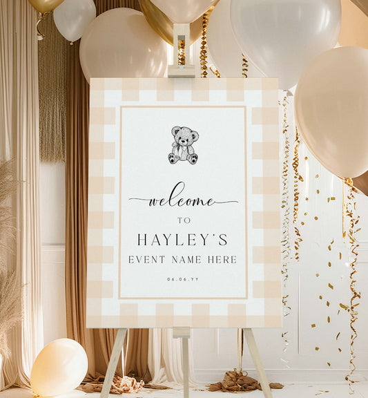 Gingham Tan Teddy Bear | Printable Welcome Sign Template