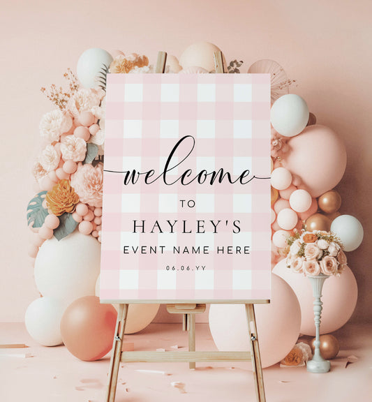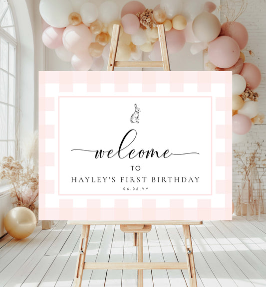 Gingham Pink Bunny | Printable Welcome Sign Template