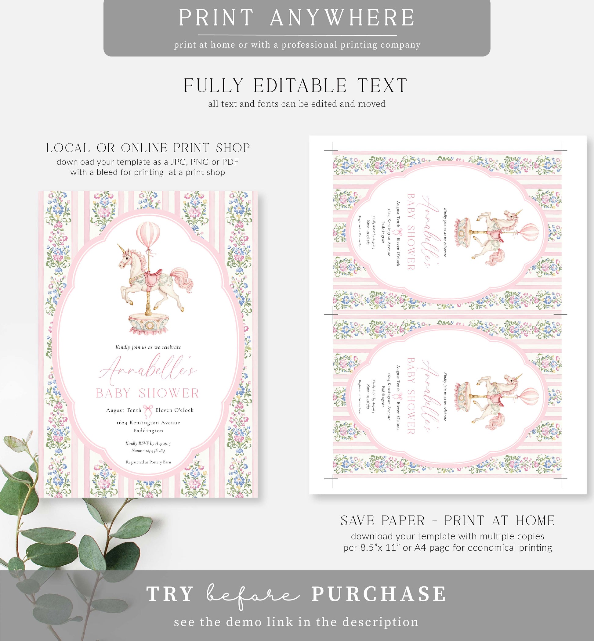 This printable baby shower invitation features a pink vintage carousel horse design with a modern calligraphy script font. The template has fully editable text that can be customised to suit any event.