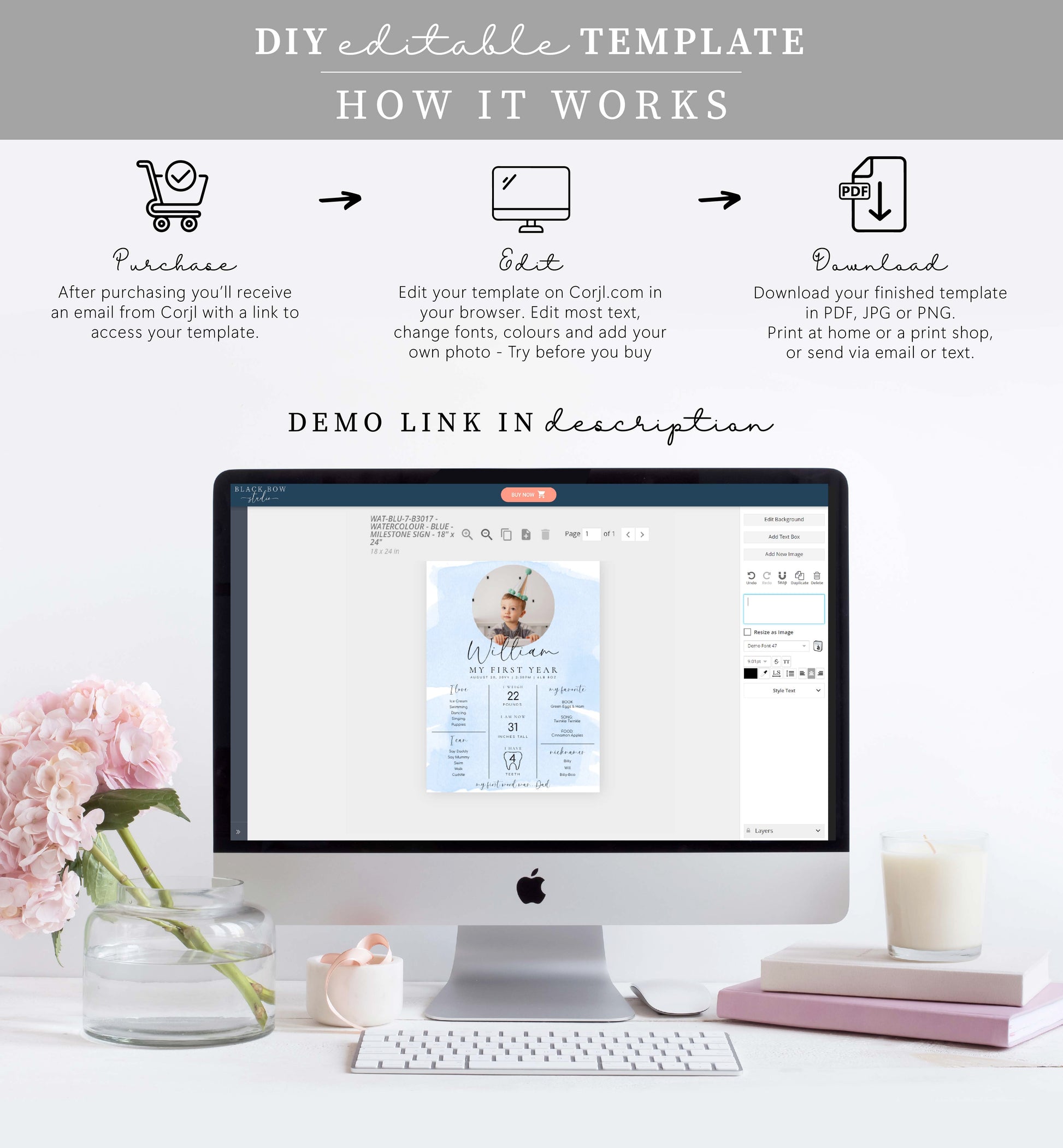 This is a do-it-yourself template editable using corjl.com – an online template editing platform that allows you to personalise your template in your internet browser – No need to install special software or download fonts. The templates are available as soon as your order has been processed.