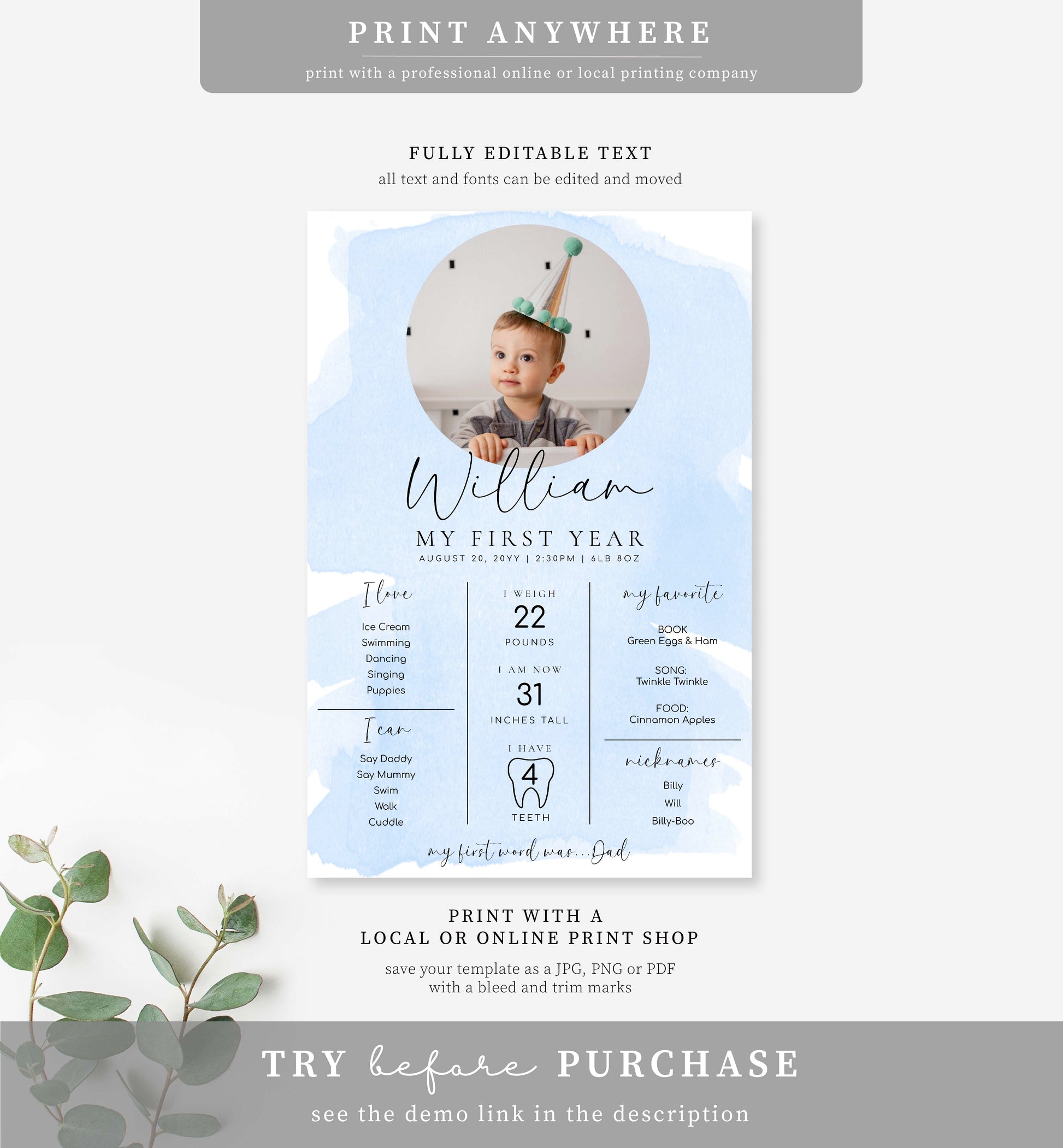 This printable first birthday milestone sign features a timeless watercolour design and fully editable text.