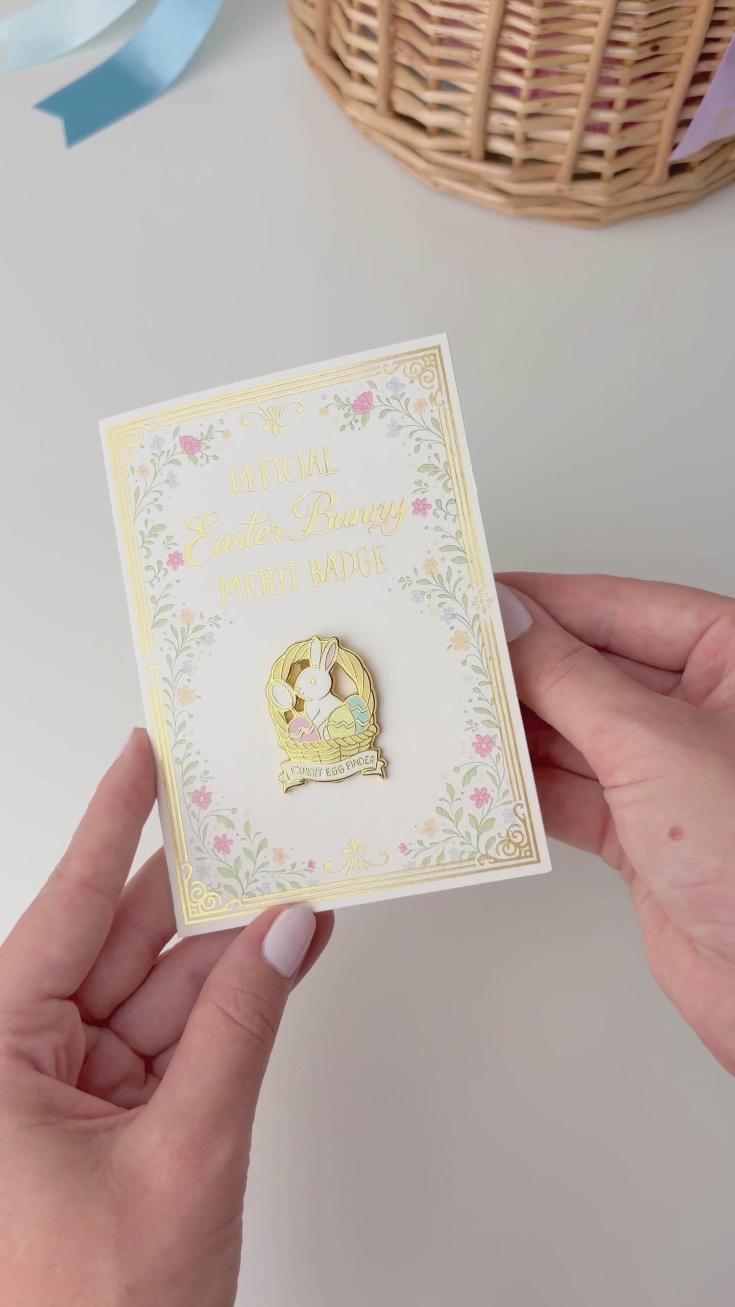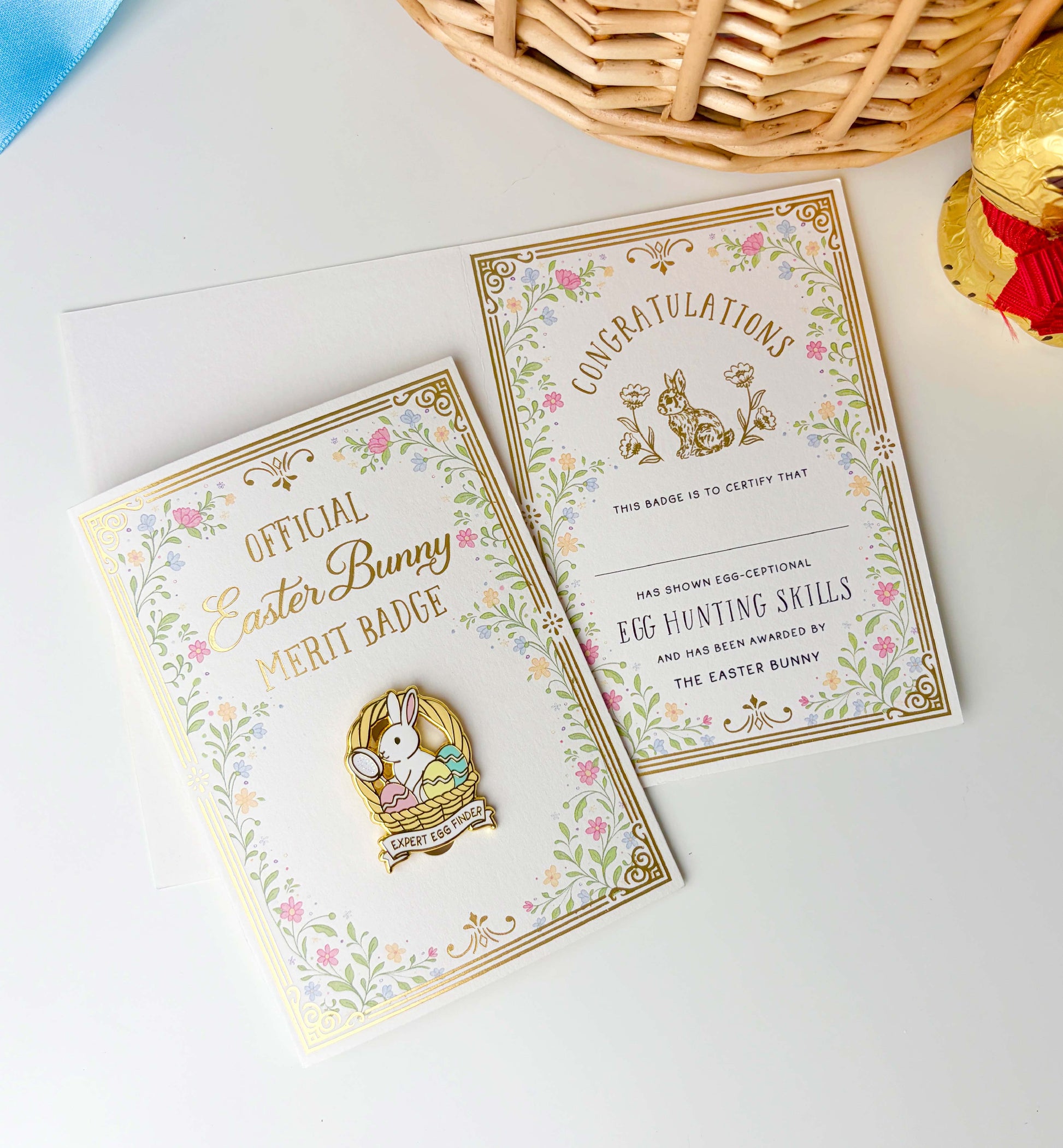 This high-quality enamel pin is packaged on a matching illustrated backing card, which opens to reveal a personalised award certificate inside. The reverse of the card features the phrase “Made in the Easter Bunny’s Burrow” to ensure its authenticity.