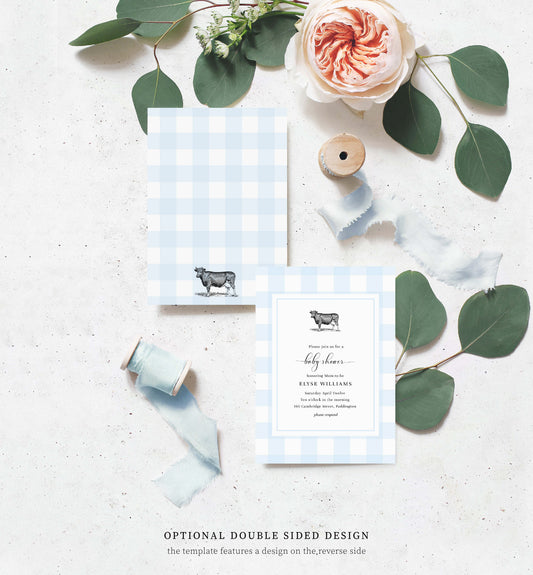 Gingham Blue Cow | Printable Baby Shower Invitation Template