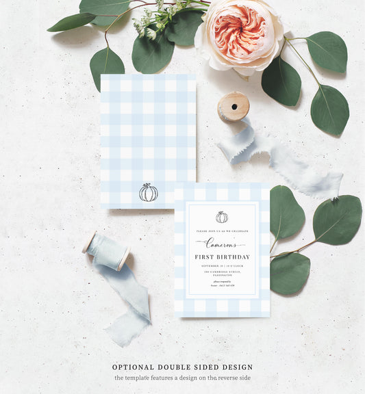 Gingham Blue Pumpkin | Printable Birthday Invitation