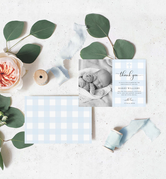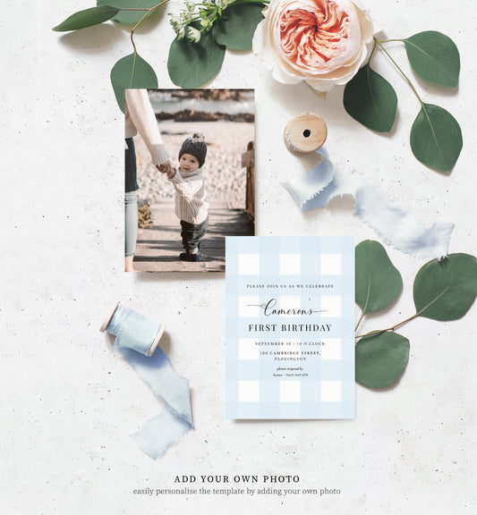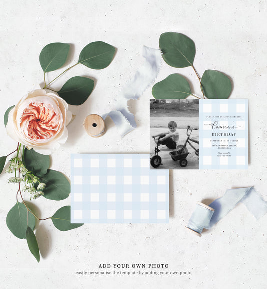 Gingham Blue | Printable Birthday Photo Invitation Template