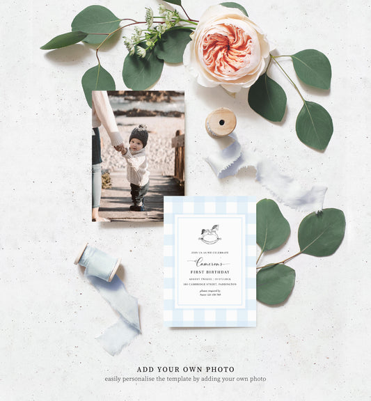 Gingham Blue Rocking Horse | Printable Birthday Invitation Template