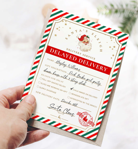 Santa's Workshop Red Green | Printable Christmas Delayed Gift Notice Template