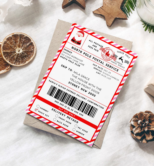 Santa's Workshop Red Pink | Printable Christmas Shipping Label Template