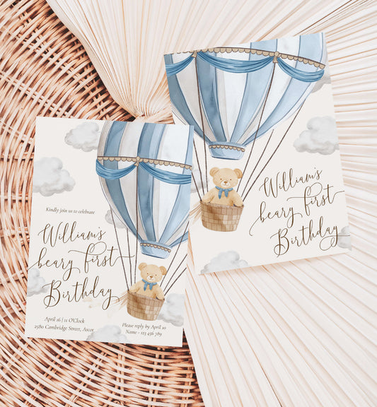 Teddy Bear Blue | Printable First Birthday Invitation Template