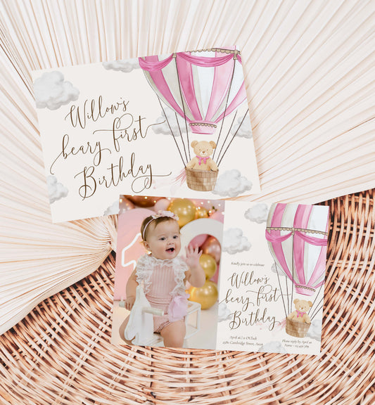 Teddy Bear Pink | Printable First Birthday Photo Invitation Template