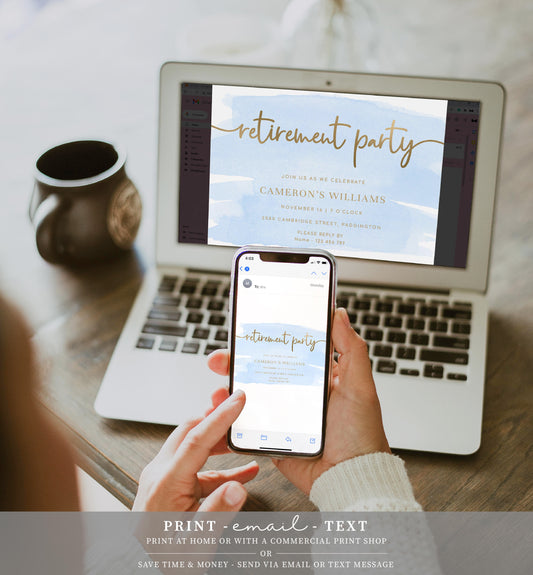 Watercolour Blue Gold | Printable Retirement Party Invitation Template