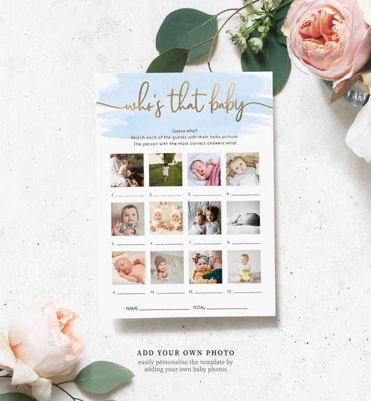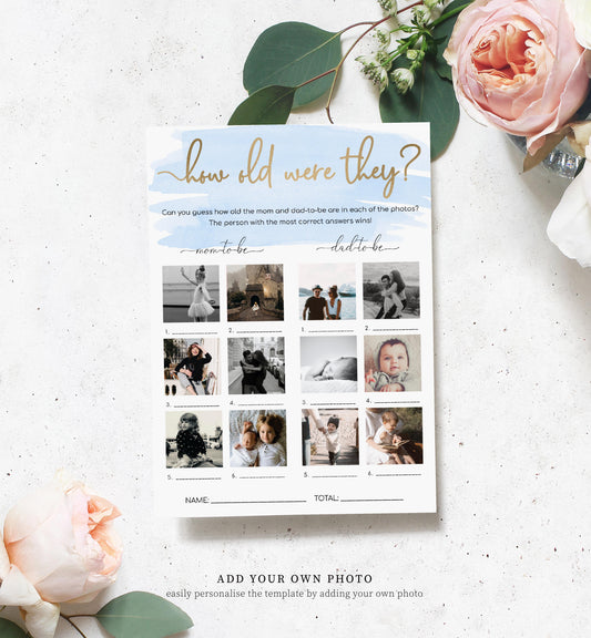 Watercolour Blue | Printable How Old Were They Photo Baby Shower Game Template