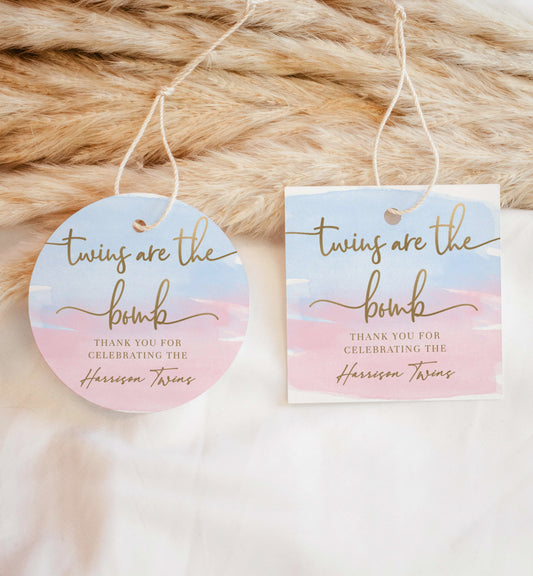 Watercolour Pink Blue Gold | Printable Twins Bath Bomb Favour Tag Template
