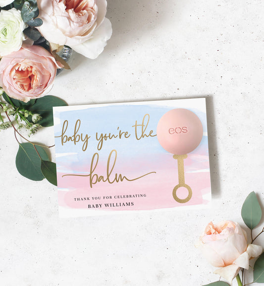 Watercolour Pink Blue | Printable Baby You're The Balm Favour Card