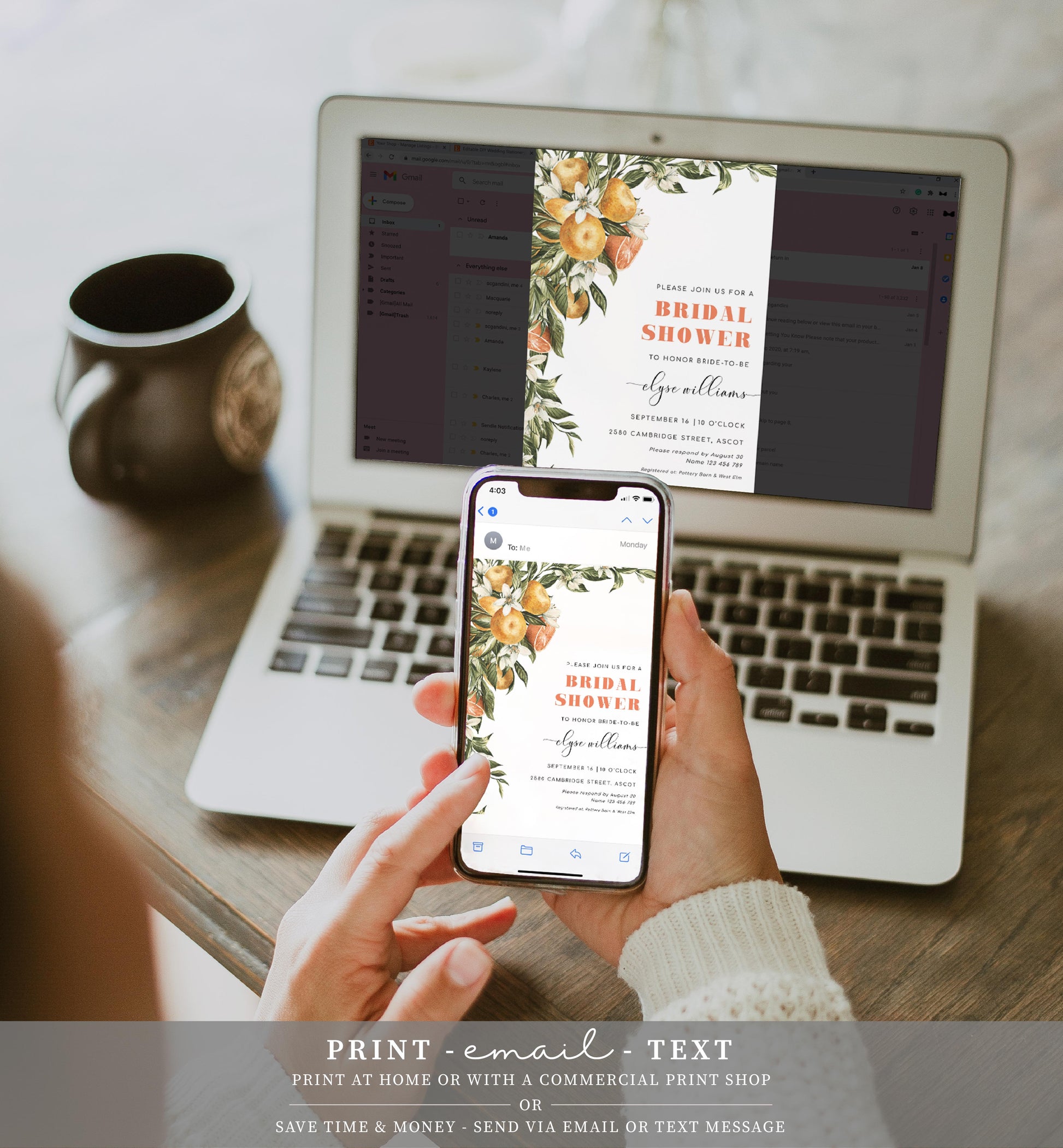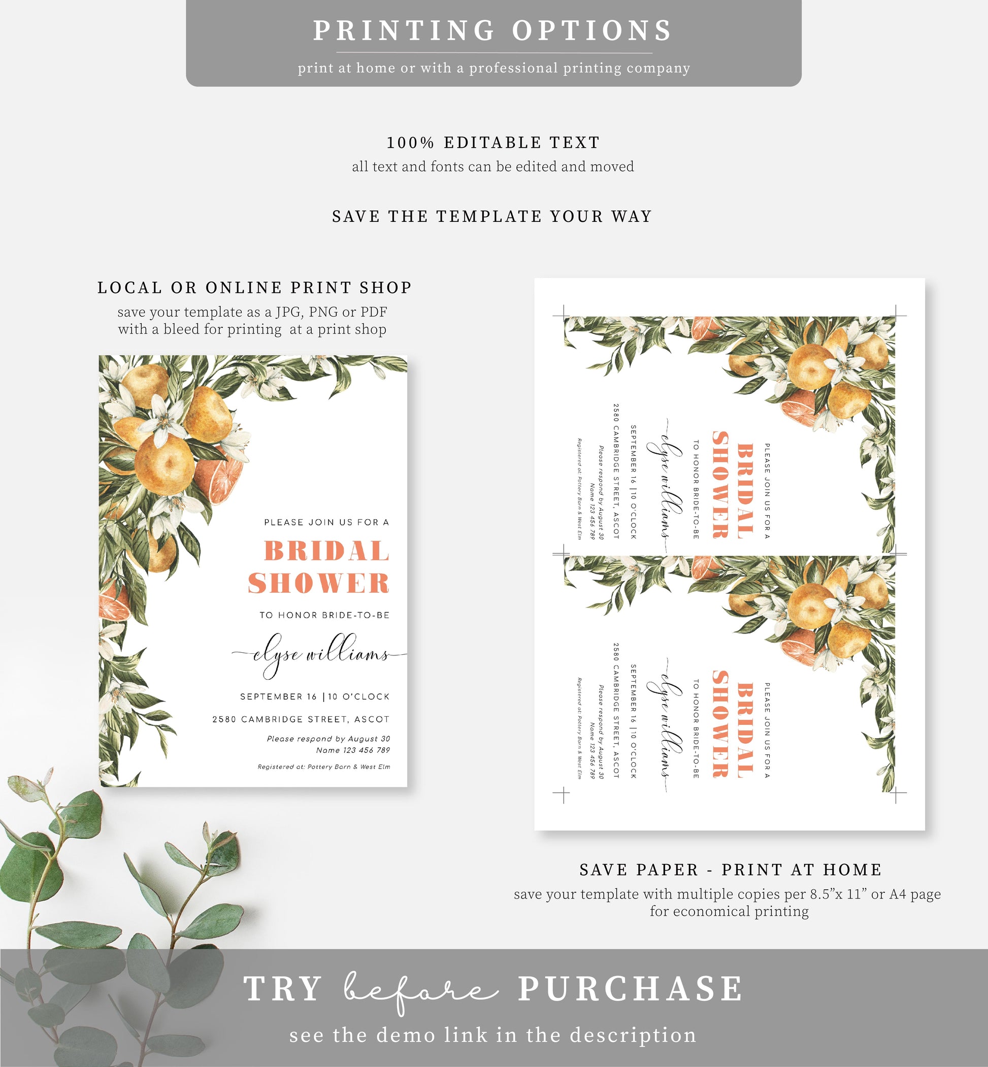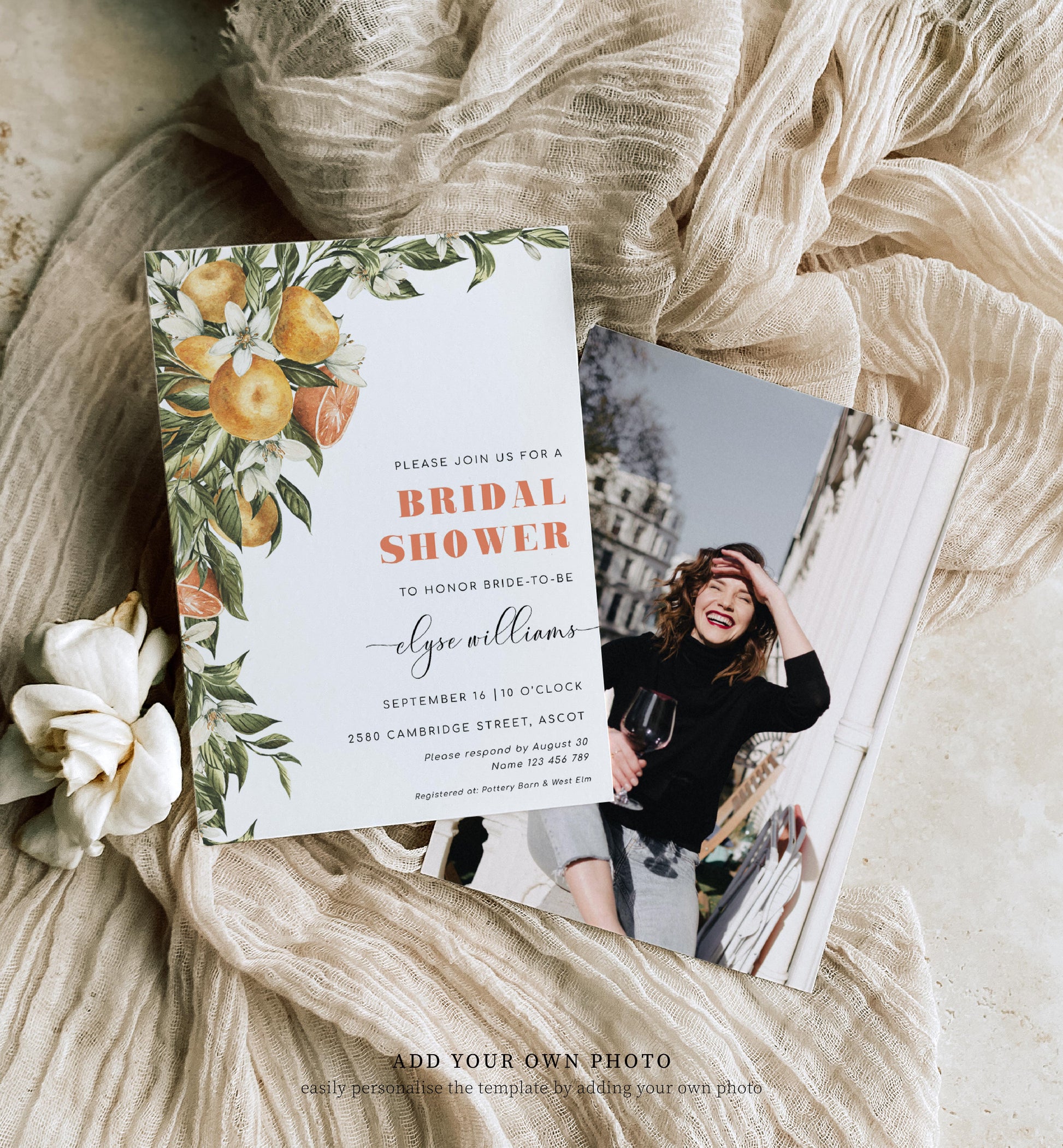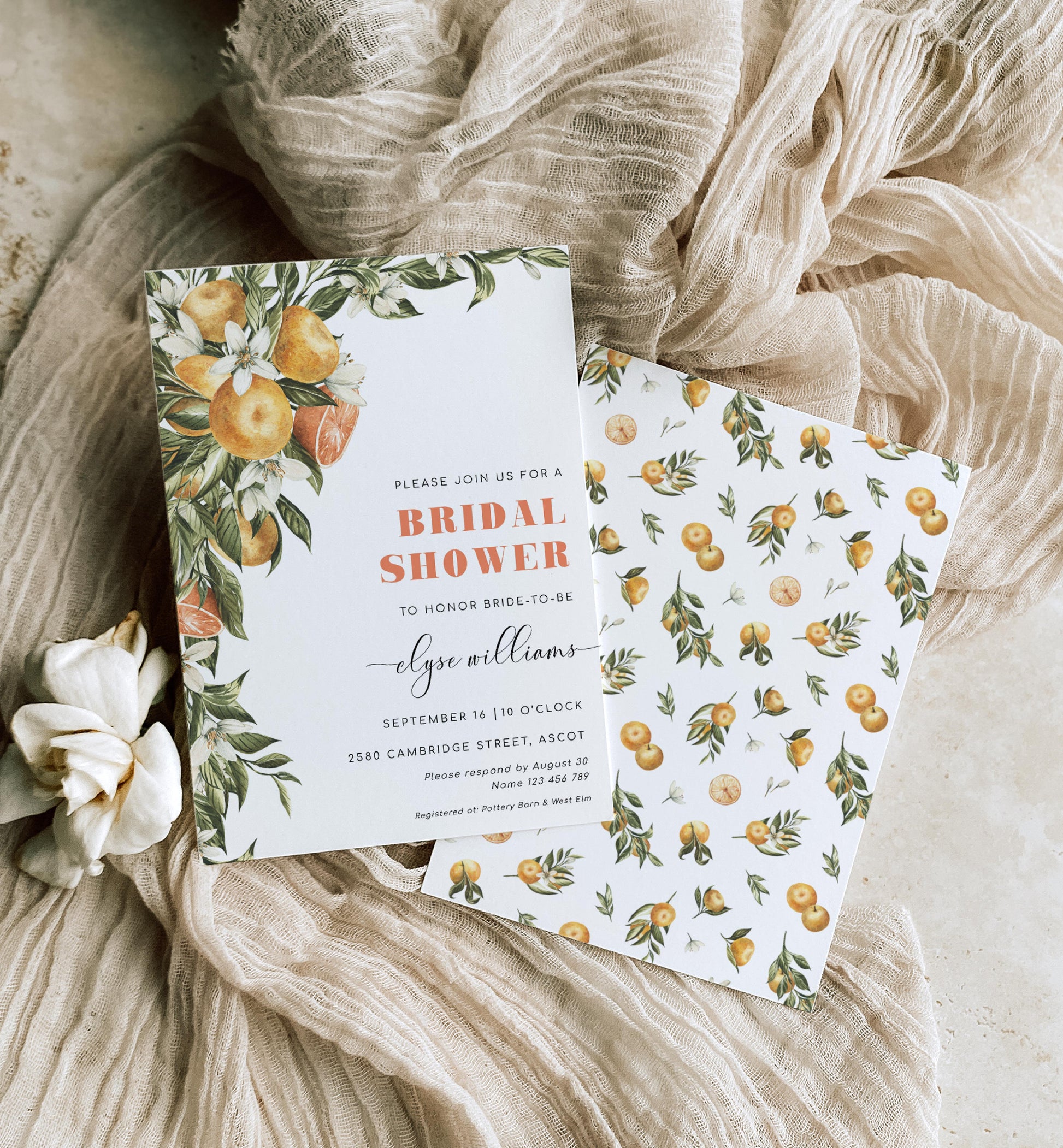 The Clementine Italian oranges bridal shower invitation features a watercolour citrus fruit and foliage design. The template has fully editable text that be customised to suit any event.