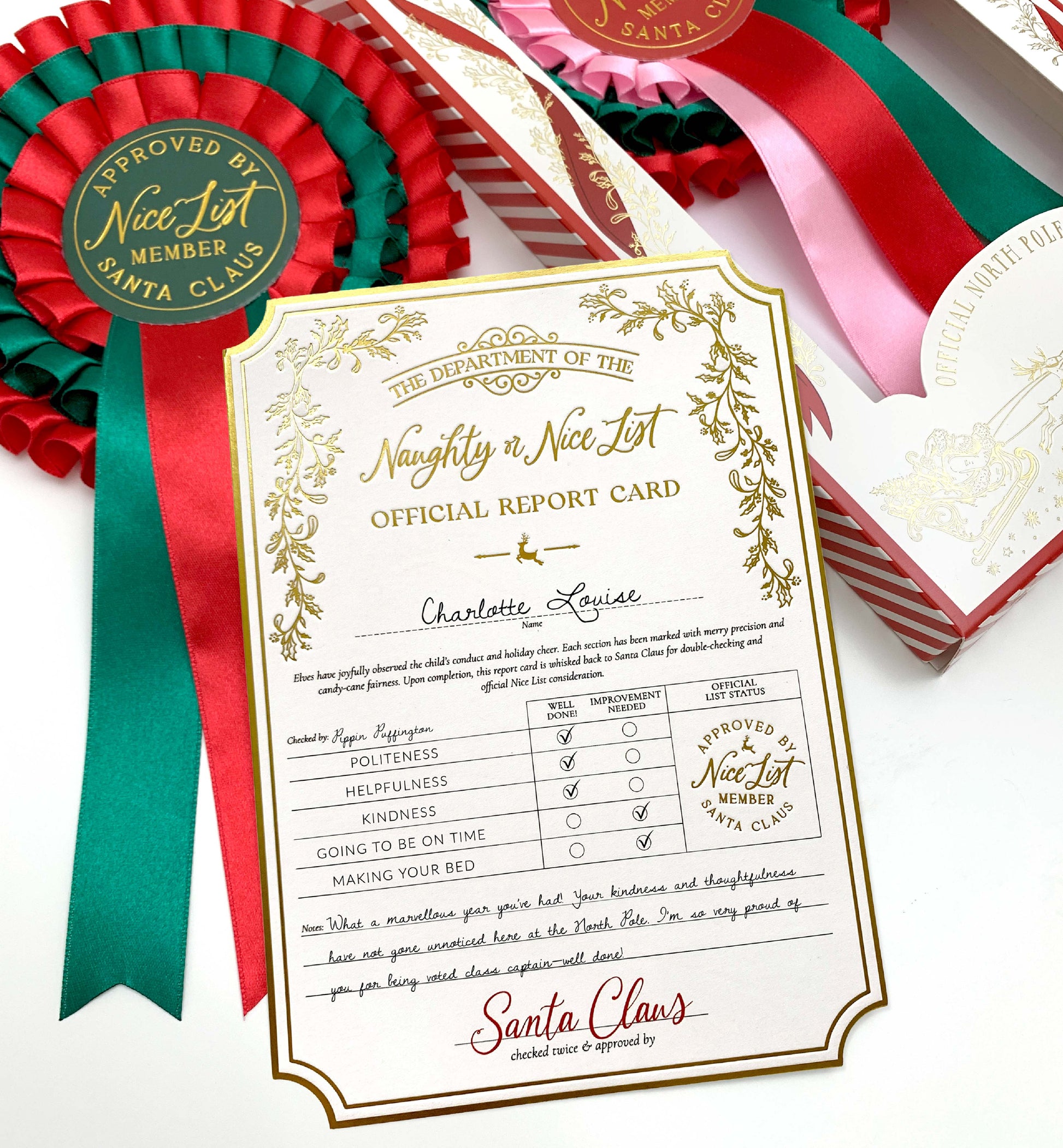 Celebrate the magic of Christmas with this festive Nice List Christmas Rosette, straight from Santa’s workshop at the North Pole. Designed in traditional red and green with elegant gold details, this official North Pole Award is approved and signed off by Santa Claus himself, the ultimate seal of approval for making it onto the Nice List.
