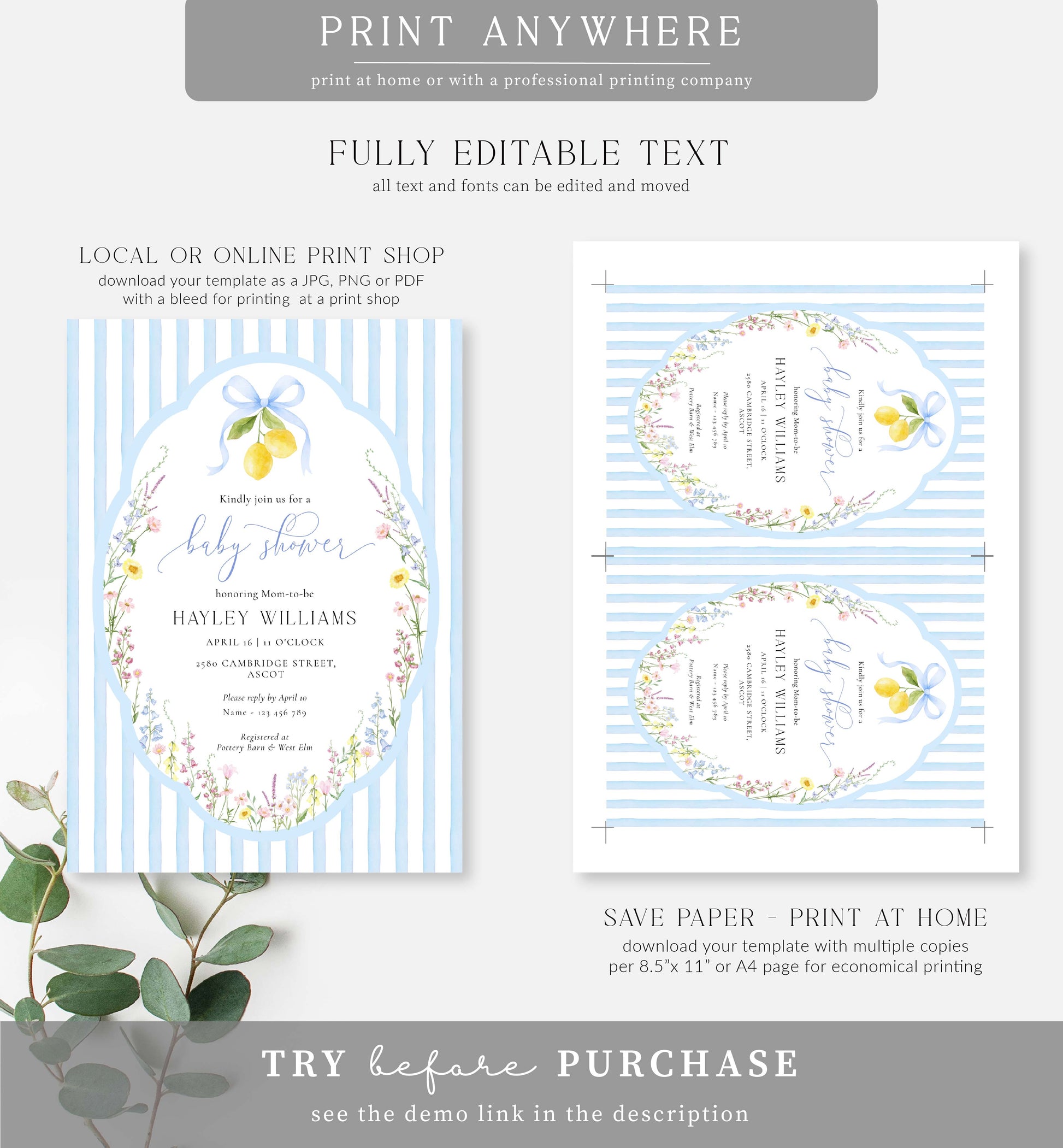 This printable baby shower invitation features a spring wildflower design with a modern calligraphy script font. The template has fully editable text that can be customised to suit any event.