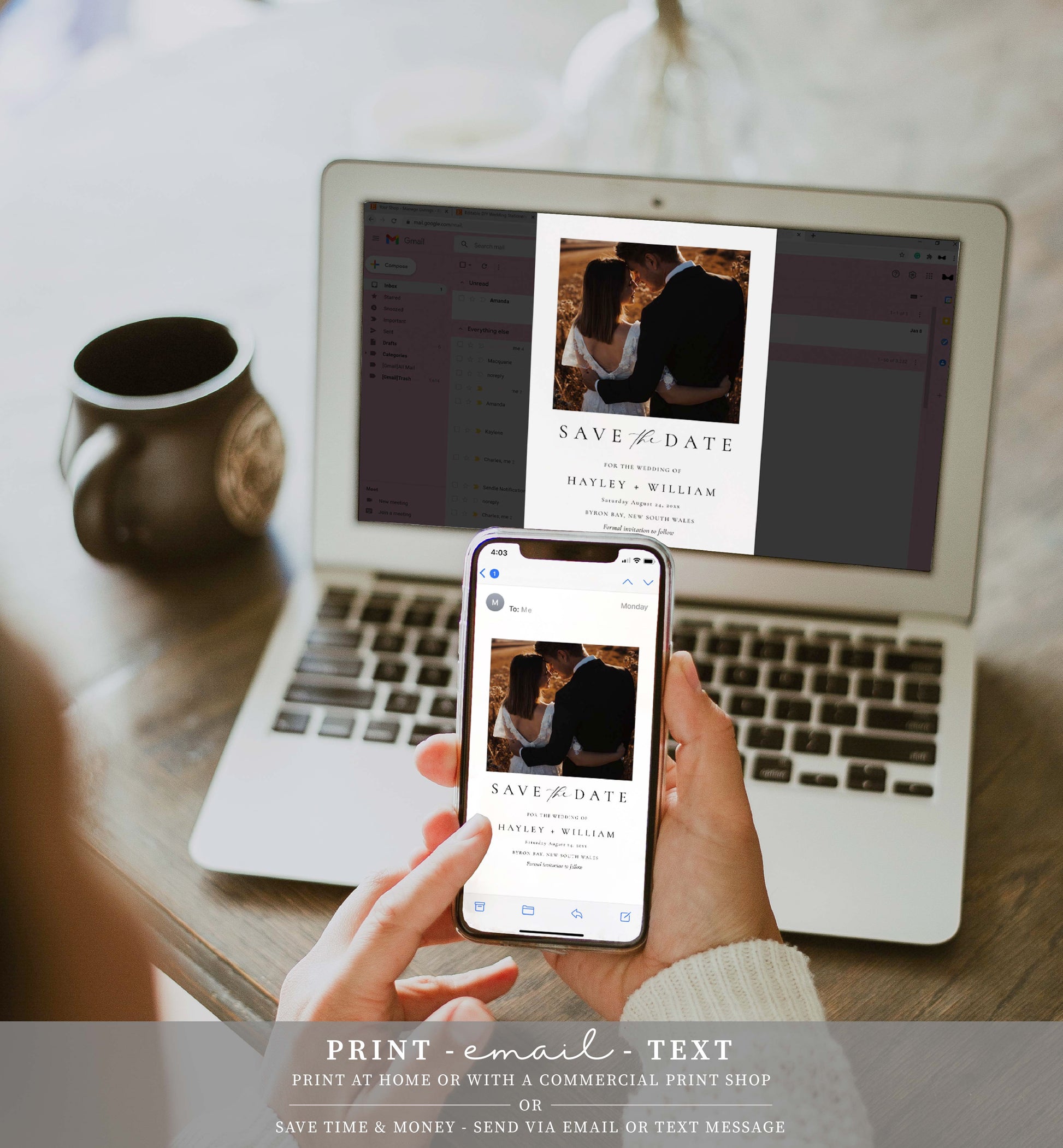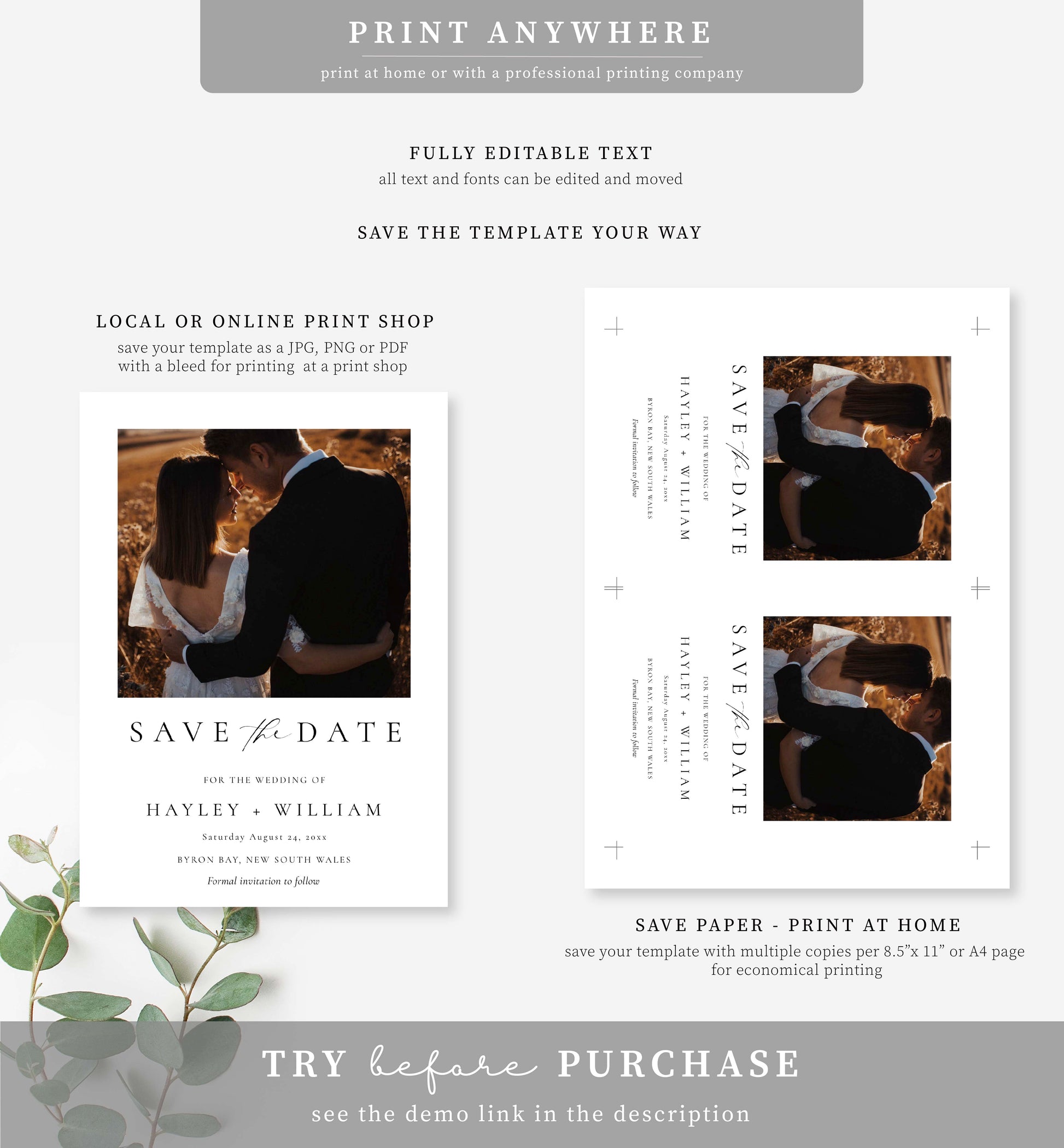 Simple and elegant, the Ellesmere printable wedding save the date features fully editable text with a modern minimalist design. Personalise the template by adding your own image. The save the date also has an optional postcard template on the reverse side to make mailing out to your friends and family easier.