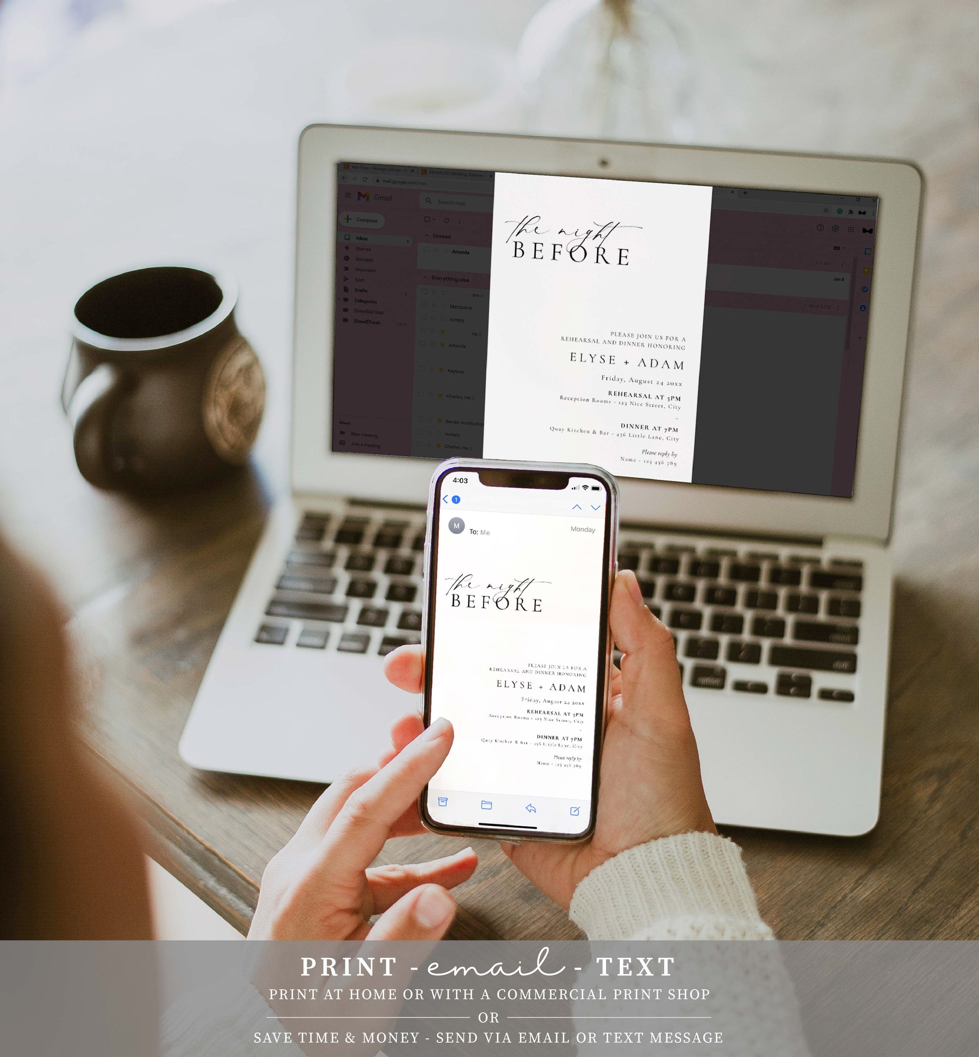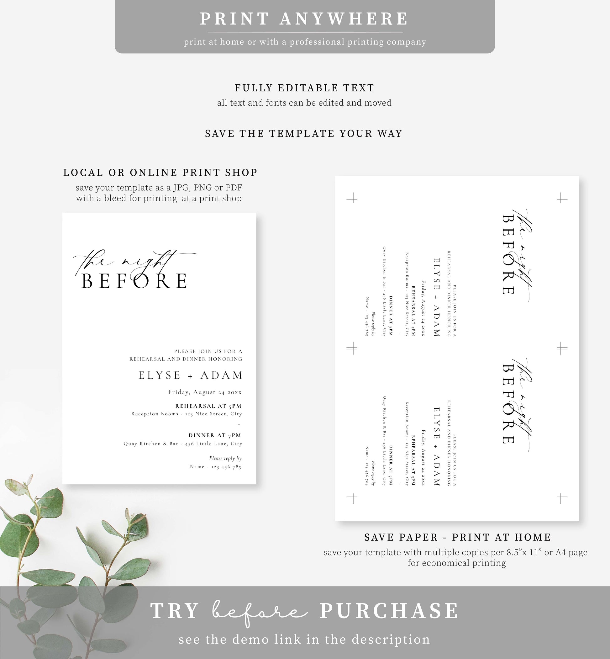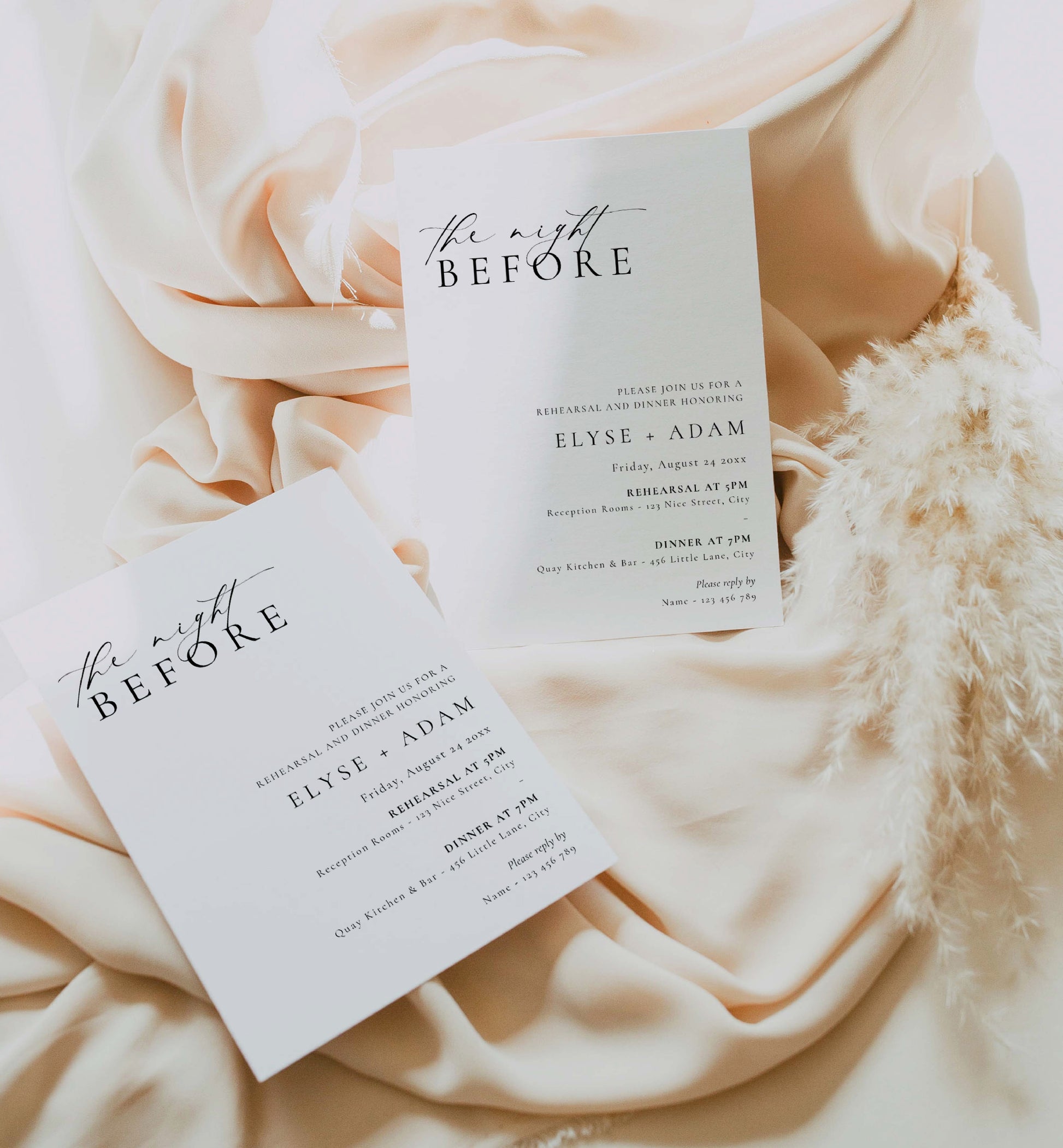 These modern minimalist wedding rehearsal dinner invitations feature fully editable text that can be customised to suit any event.
