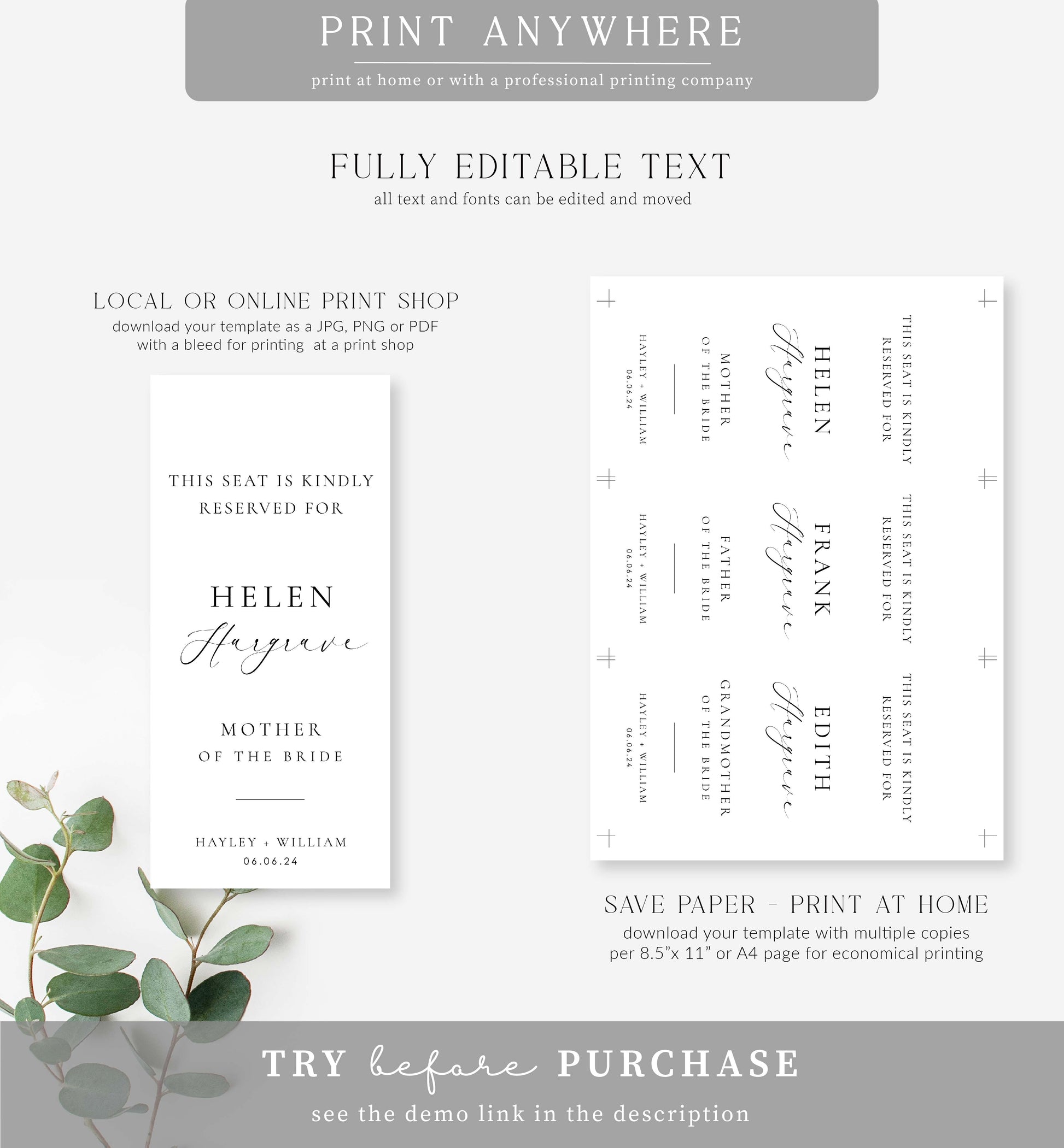 This printable wedding reserved seat sign template features a clean modern minimalist design with fully editable text that can be customised with any name.
