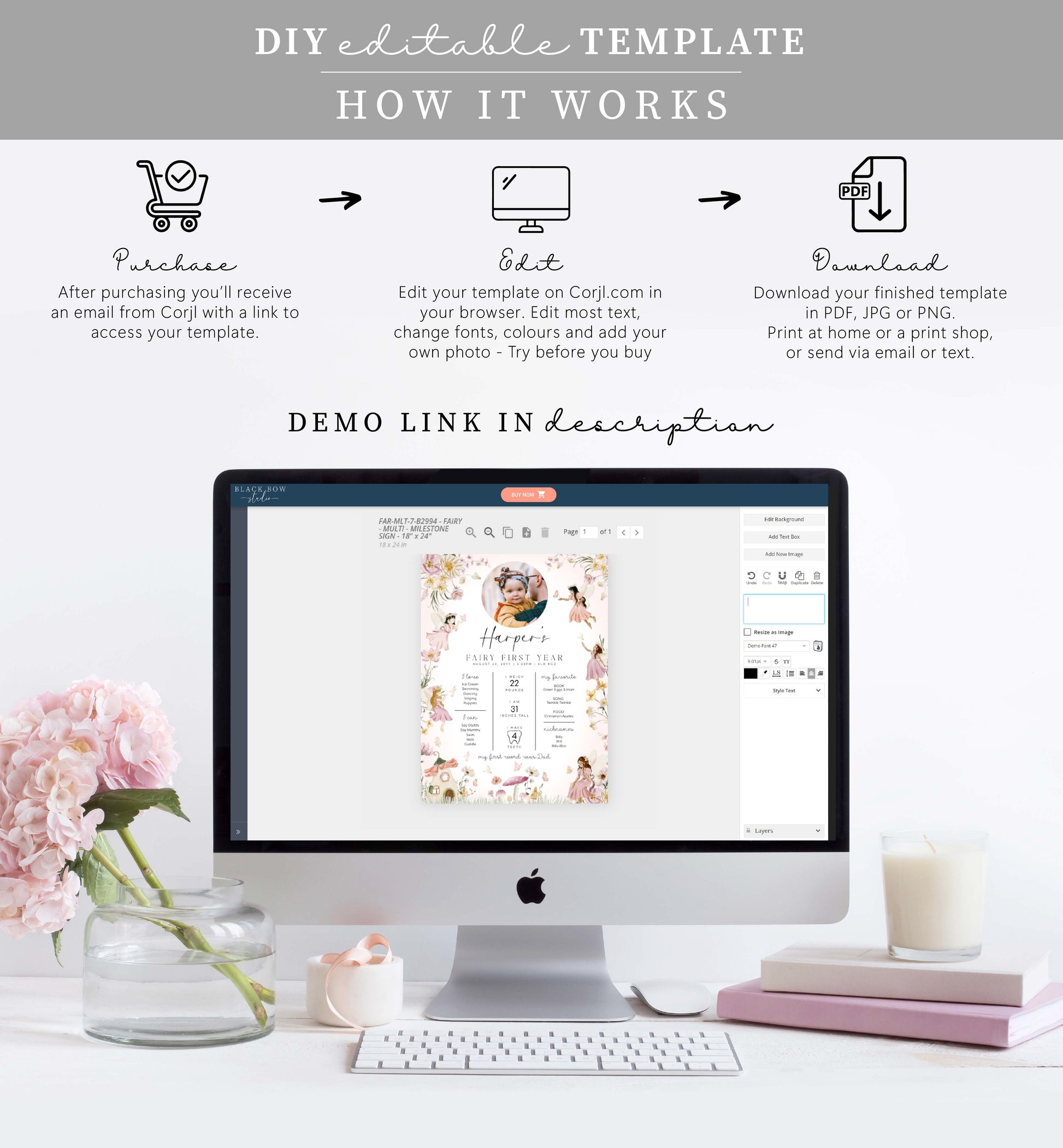 This is a do-it-yourself template editable using corjl.com – an online template editing platform that allows you to personalise your template in your internet browser – No need to install special software or download fonts. The templates are available as soon as your order has been processed.