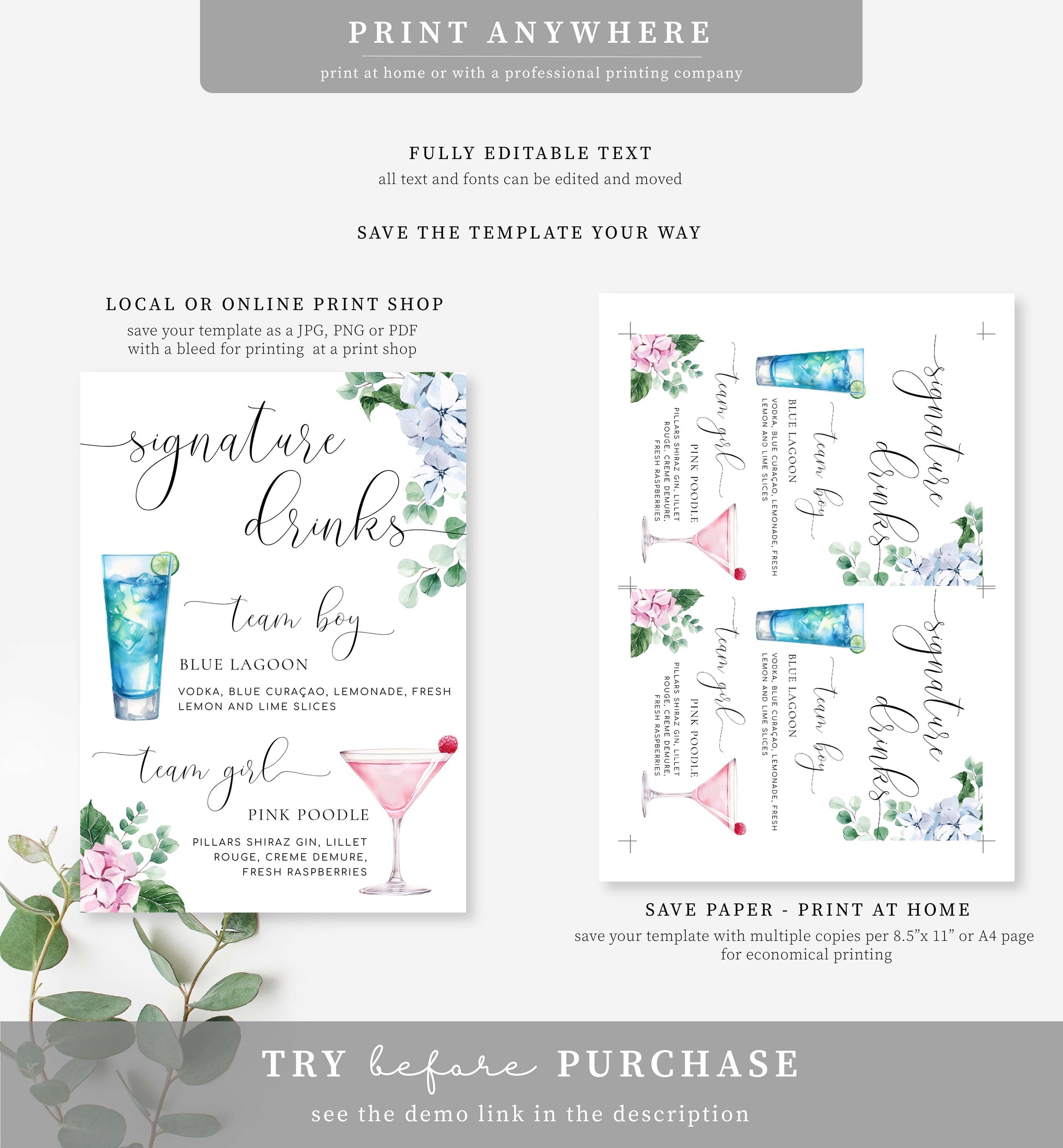 This printable team boy team girl drinks sign template features a watercolour pink and blue hydrangea design together with a modern hand-lettered script heading.