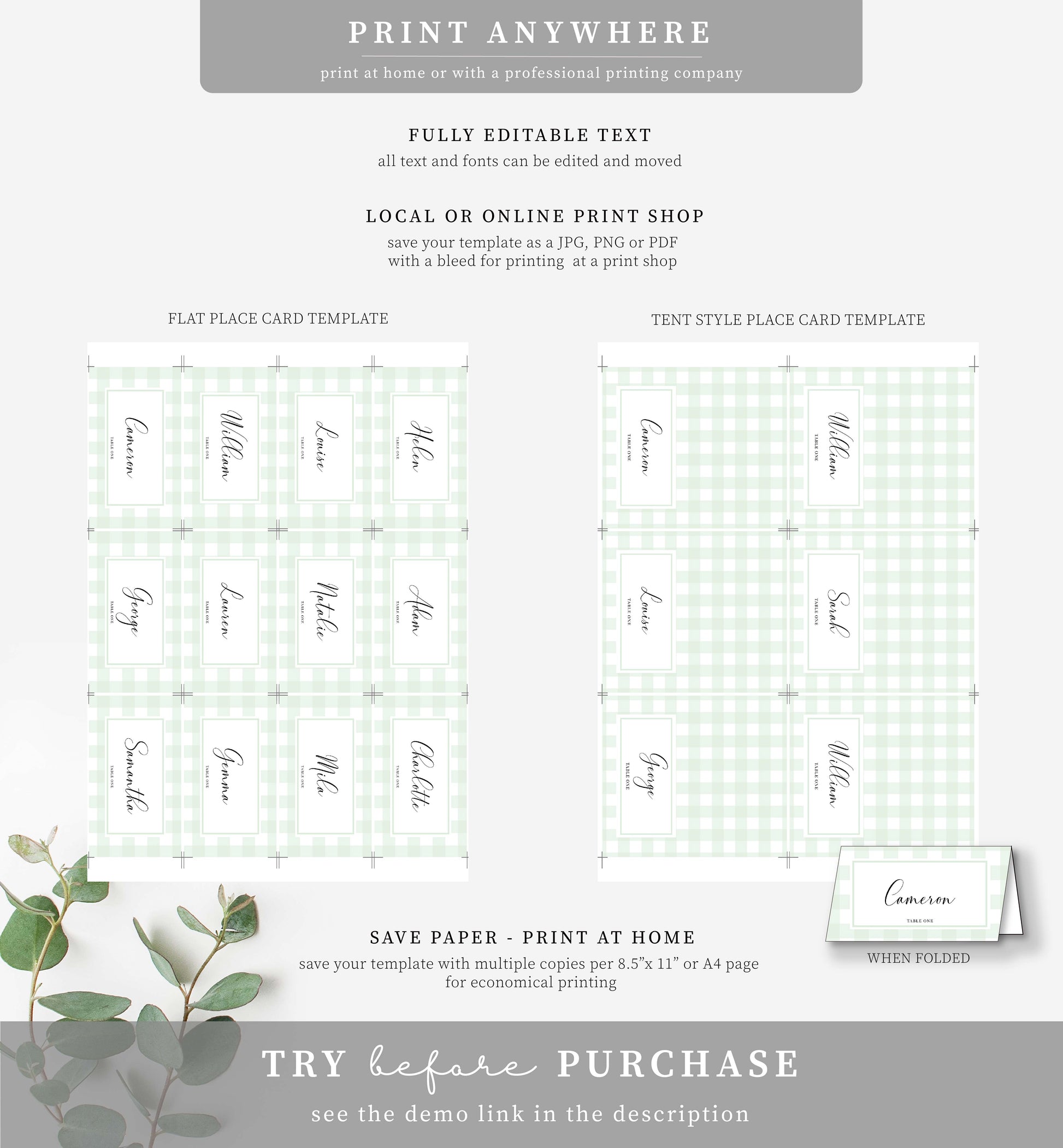 Gingham Green | Printable Place Cards Template