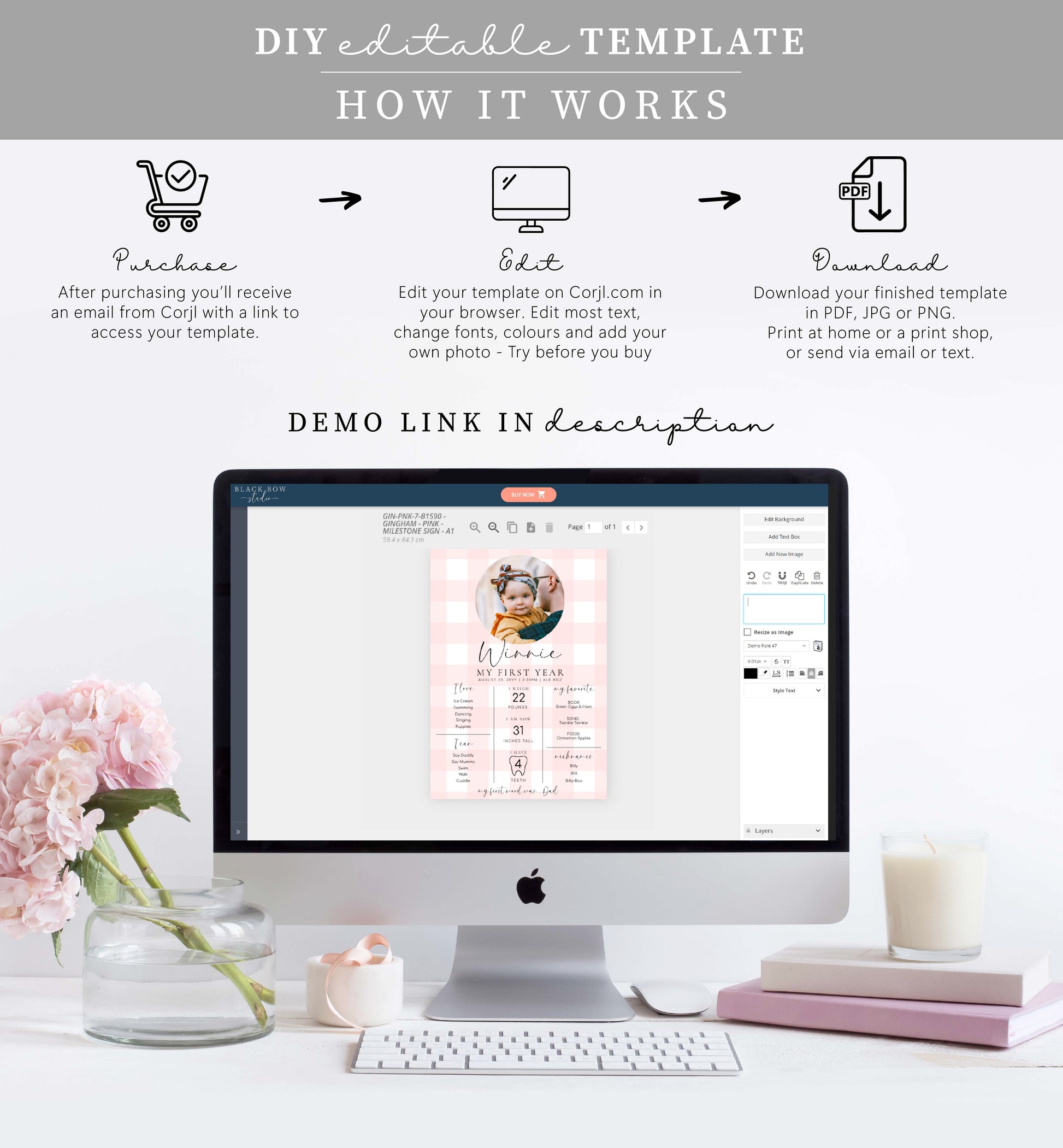 This is a do-it-yourself template editable using corjl.com – an online template editing platform that allows you to personalise your template in your internet browser – No need to install special software or download fonts. The templates are available as soon as your order has been processed.