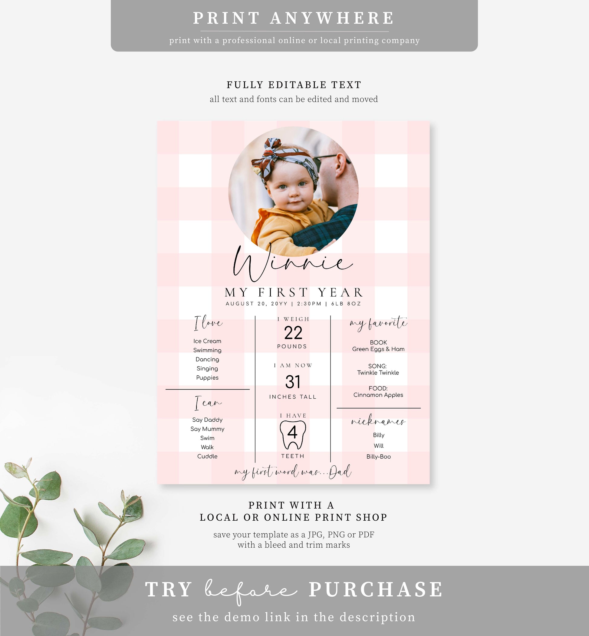 This printable first birthday milestone sign features a classic gingham design and fully editable text.