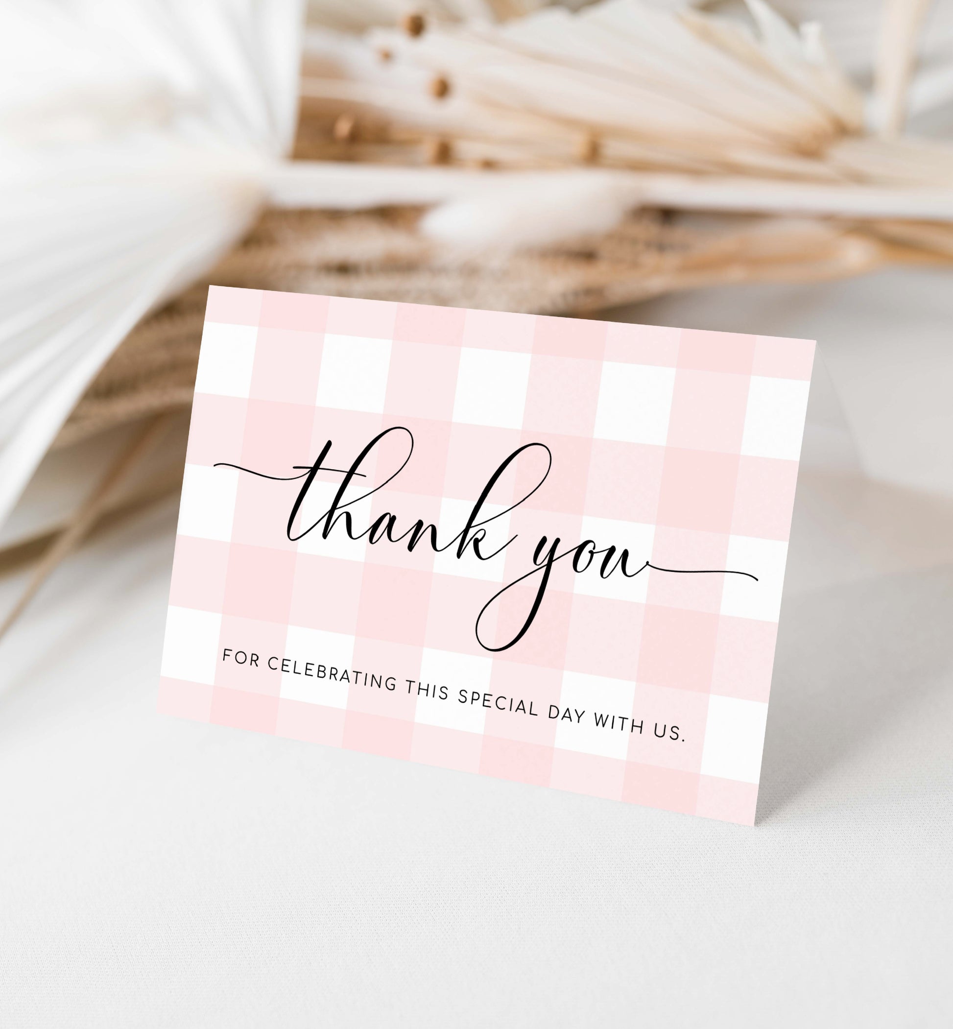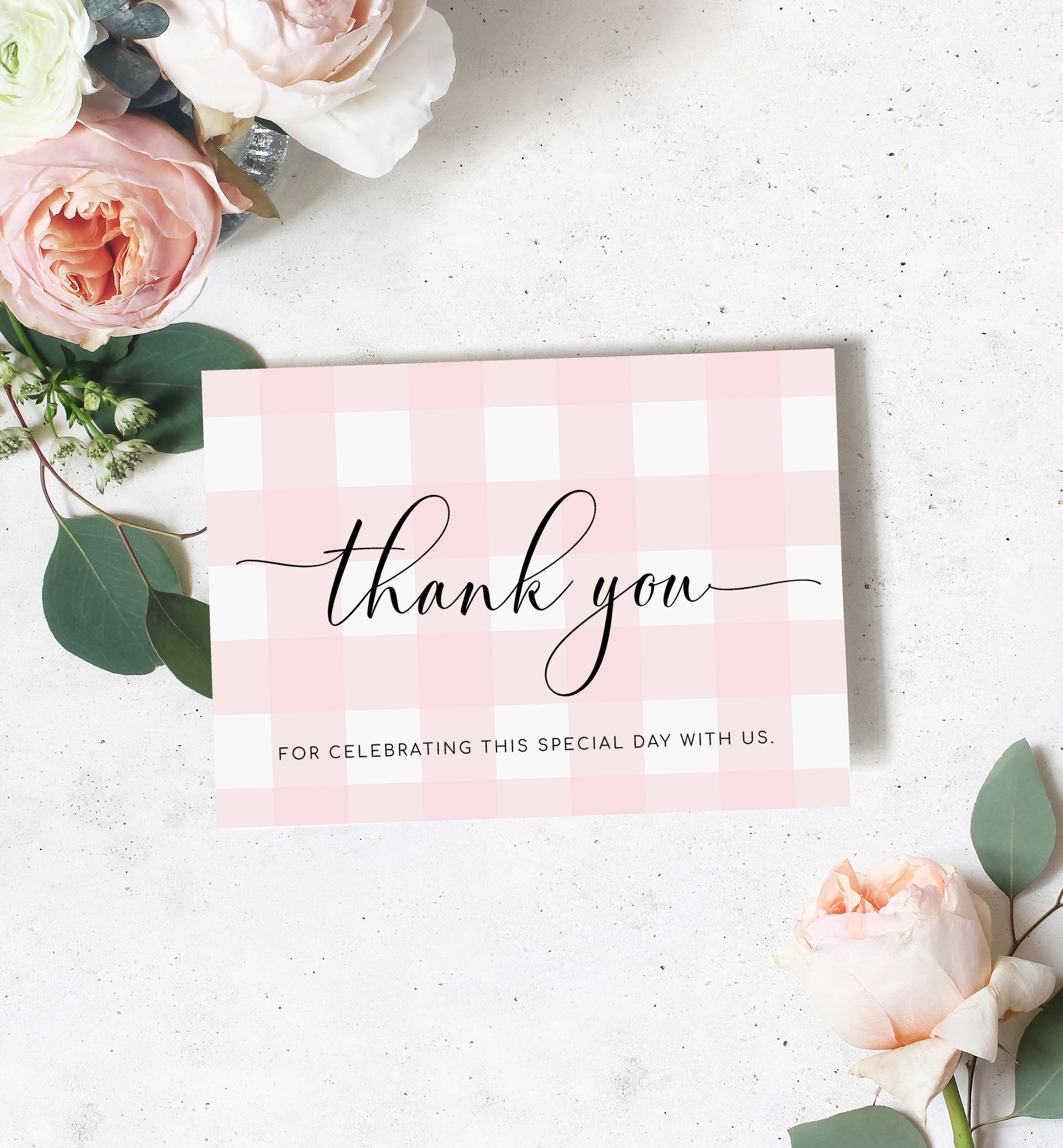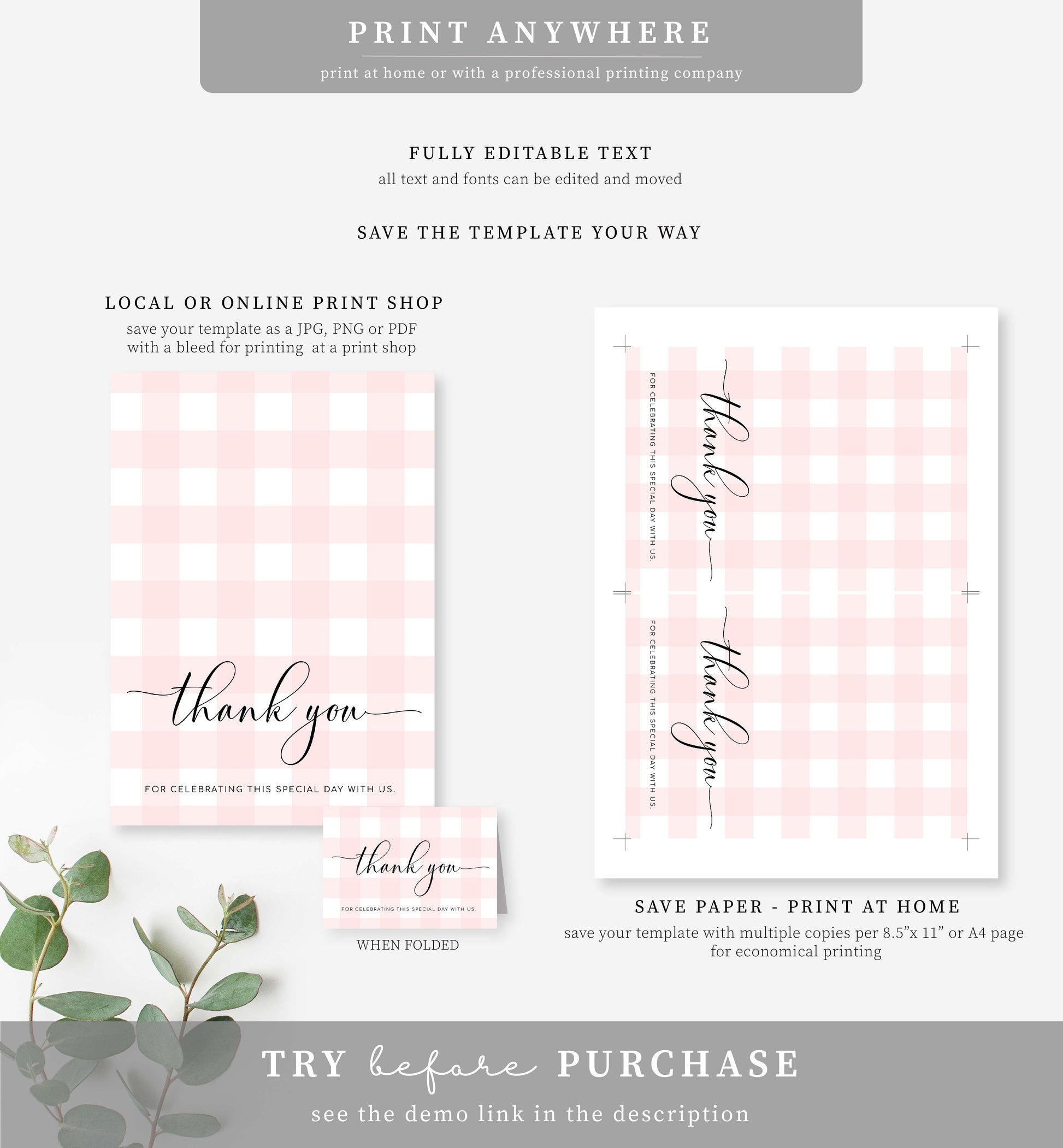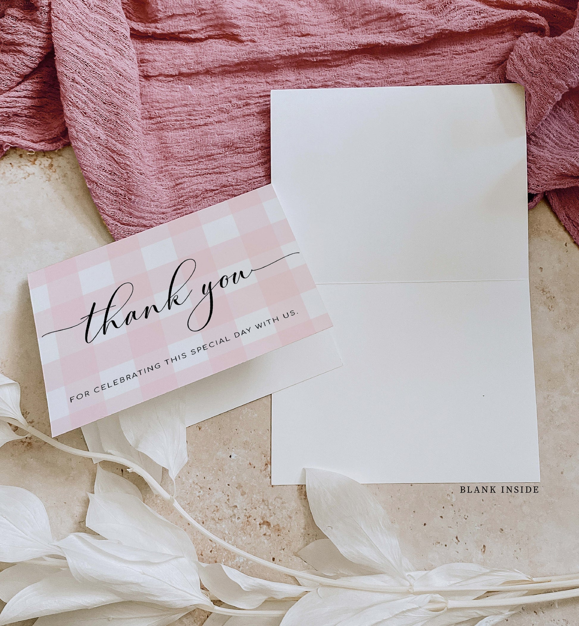 The printable thank you cards feature a classic gingham design. Both Flat and folded cards are included. The template has fully editable text and can be customised to suit any event.