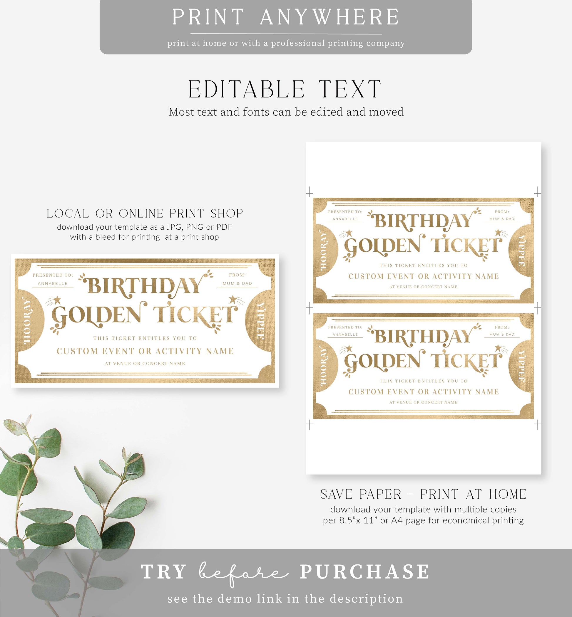 Golden Ticket Gold | Printable Birthday Custom Gift Voucher Template