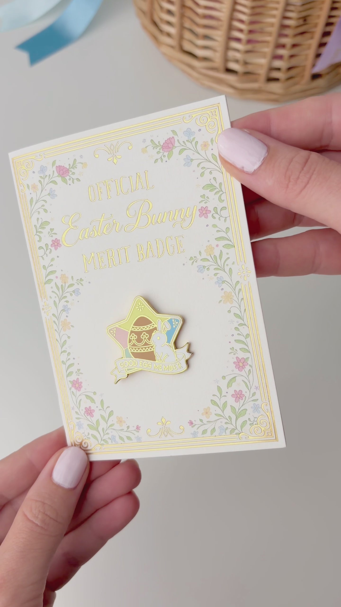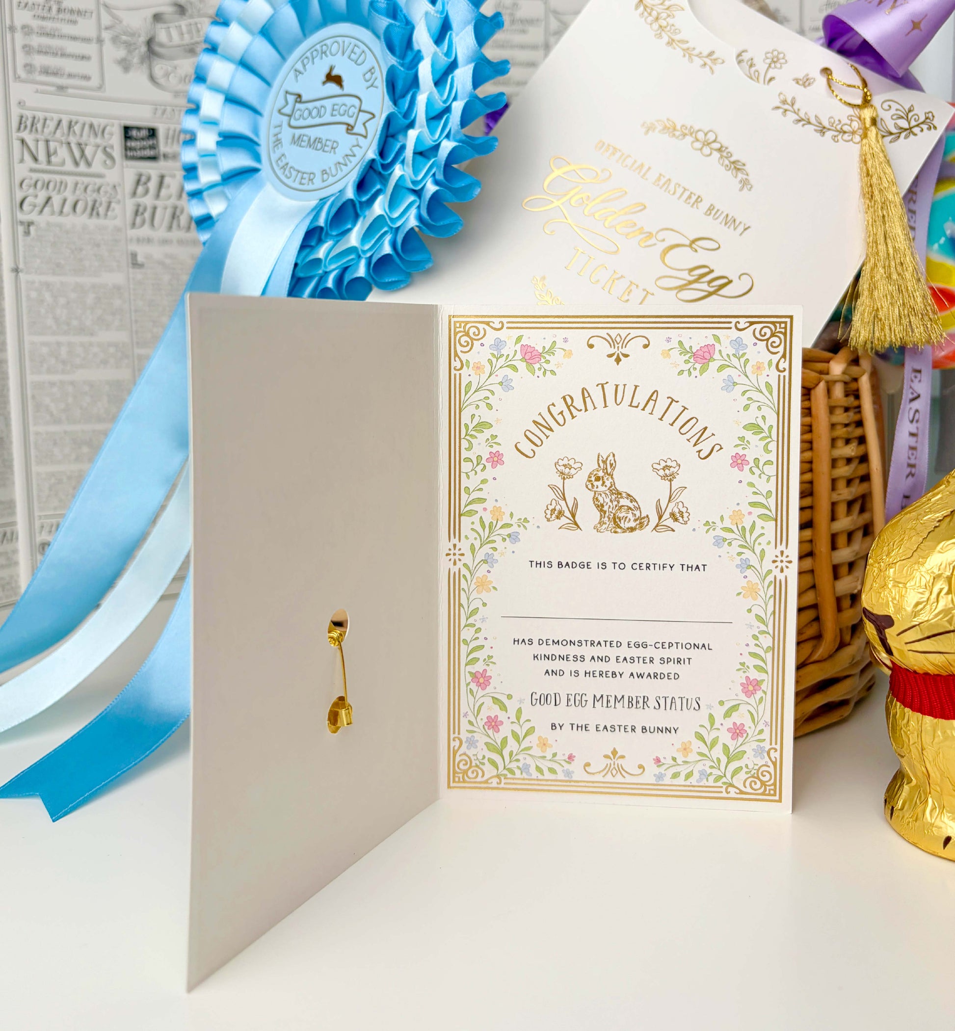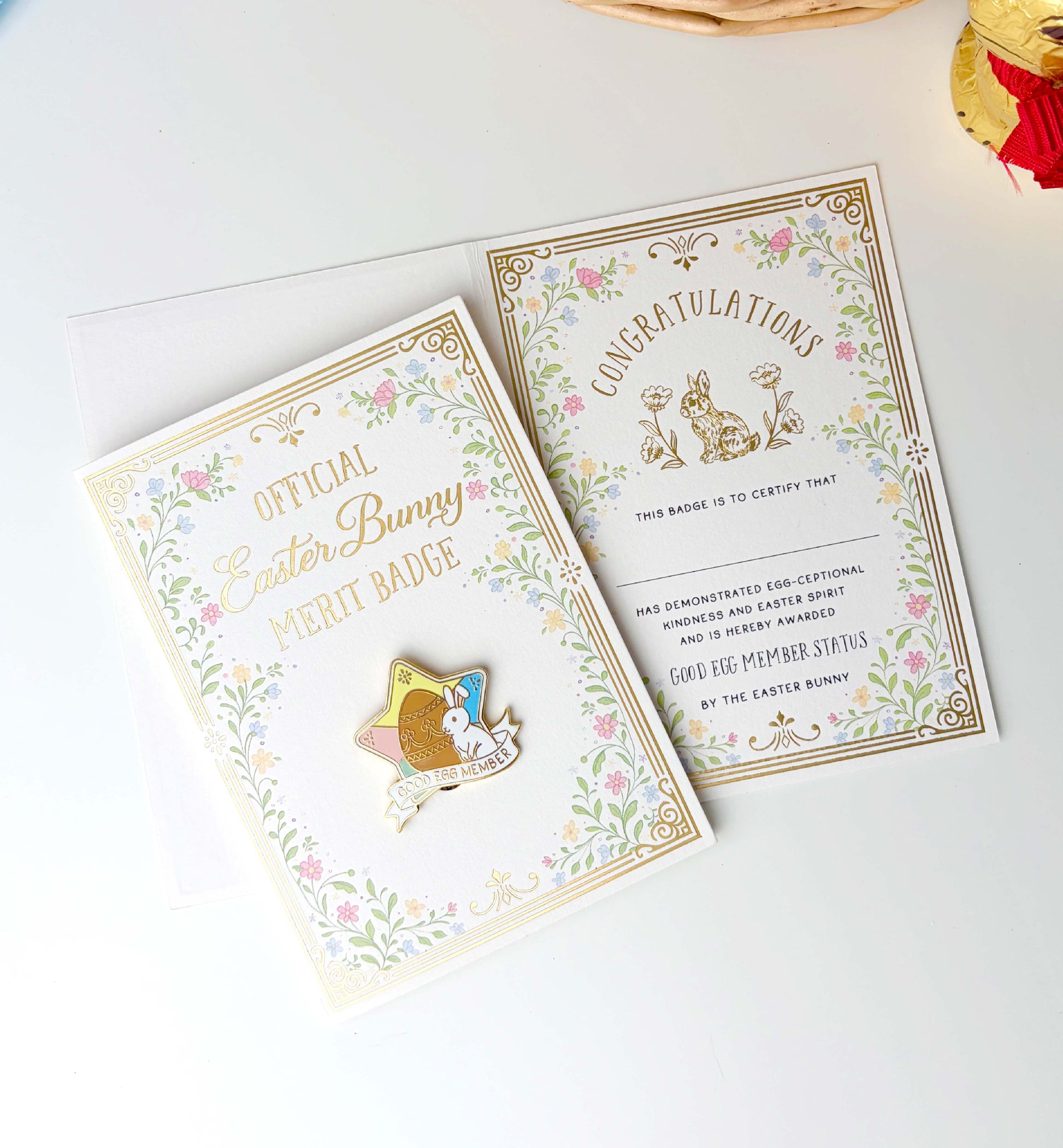 This high-quality enamel pin is packaged on a matching illustrated backing card, featuring soft pastel florals and elegant detailing. The card opens to reveal an award certificate inside, with a space for adding your child's name. The reverse of the card includes the phrase “Made in the Easter Bunny’s Burrow” to ensure its authenticity.