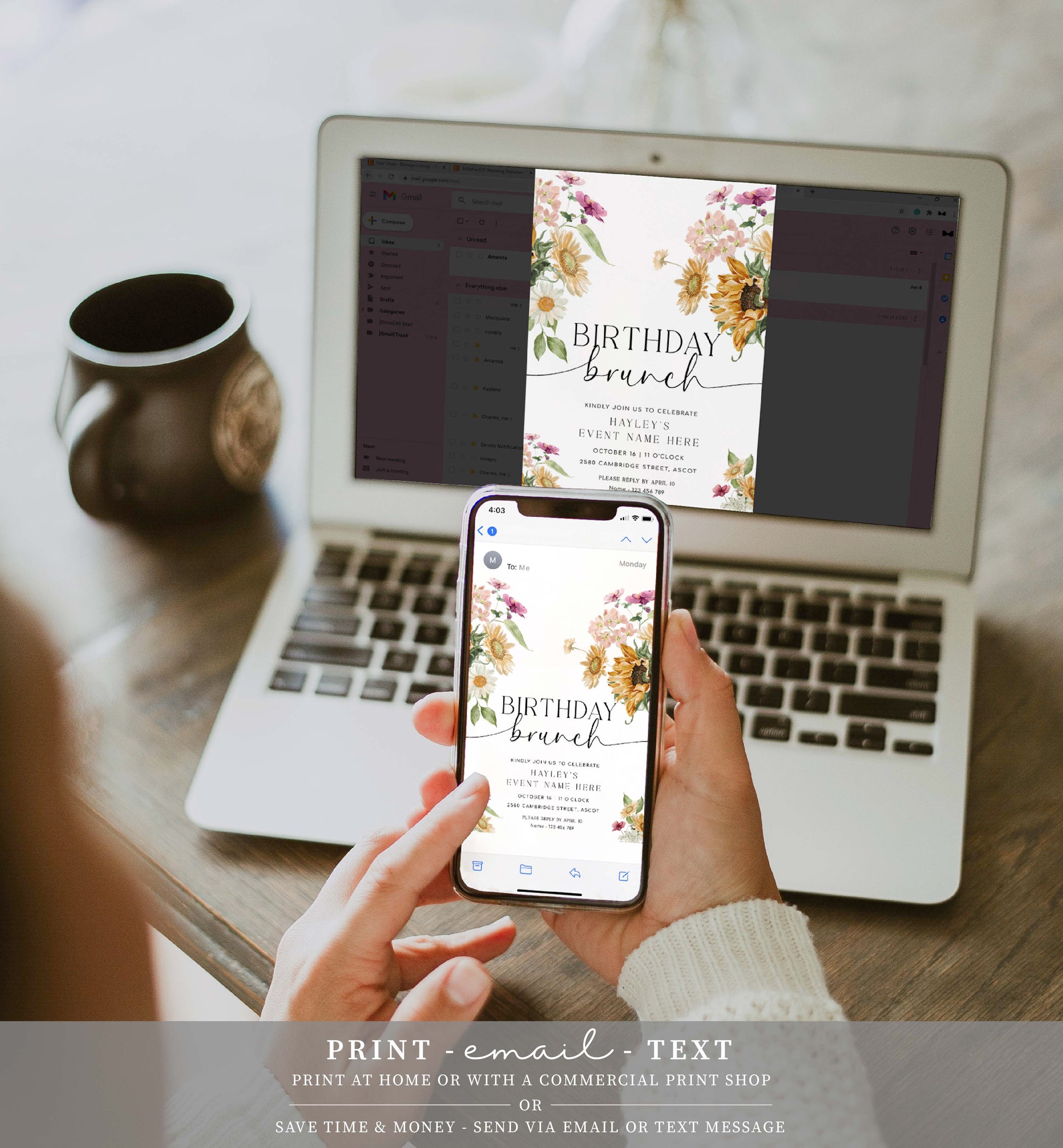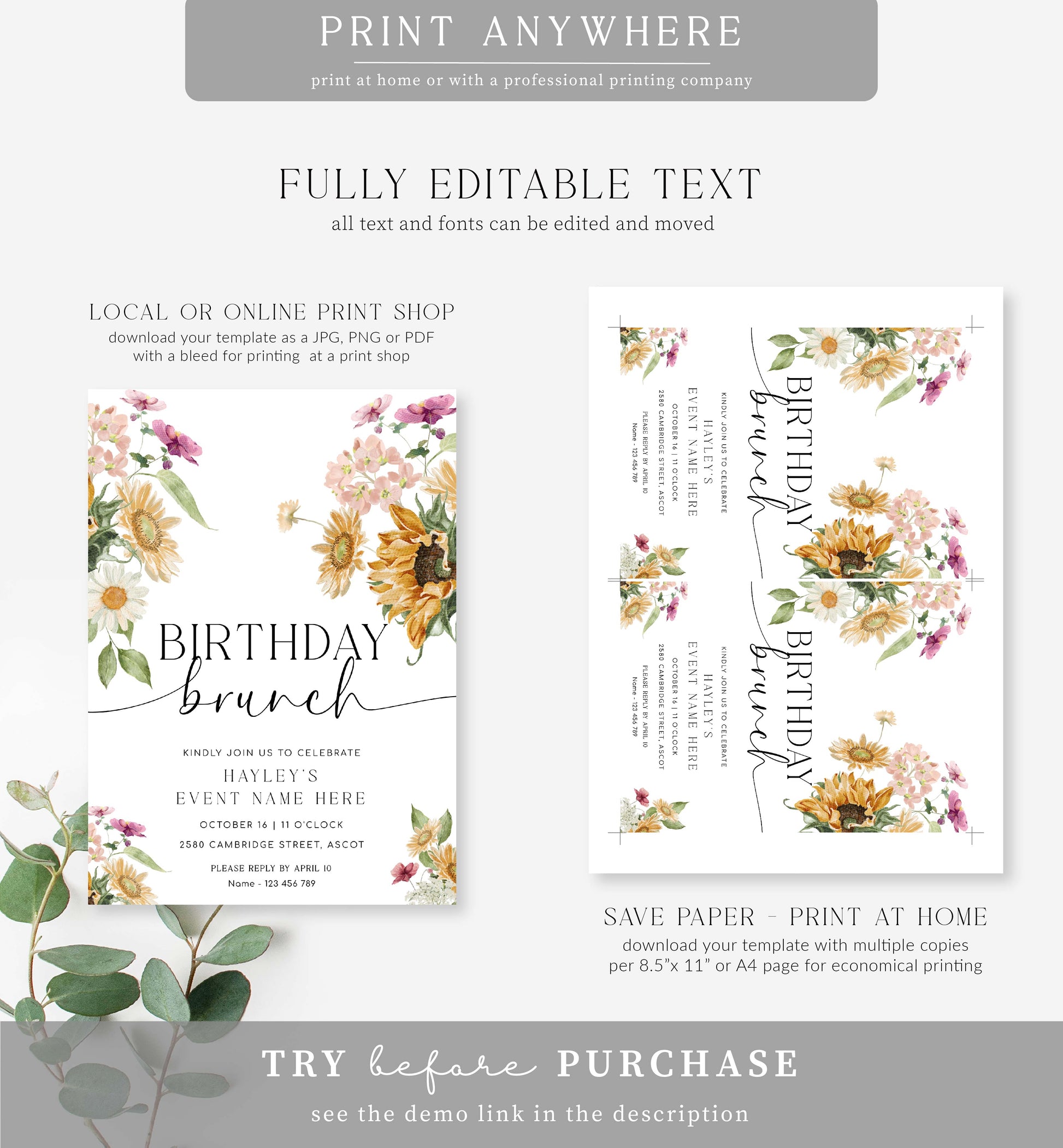 The Mews Floral birthday brunch invitation features an autumn sunflower floral design. The template has fully editable text that can be customised to suit any event.