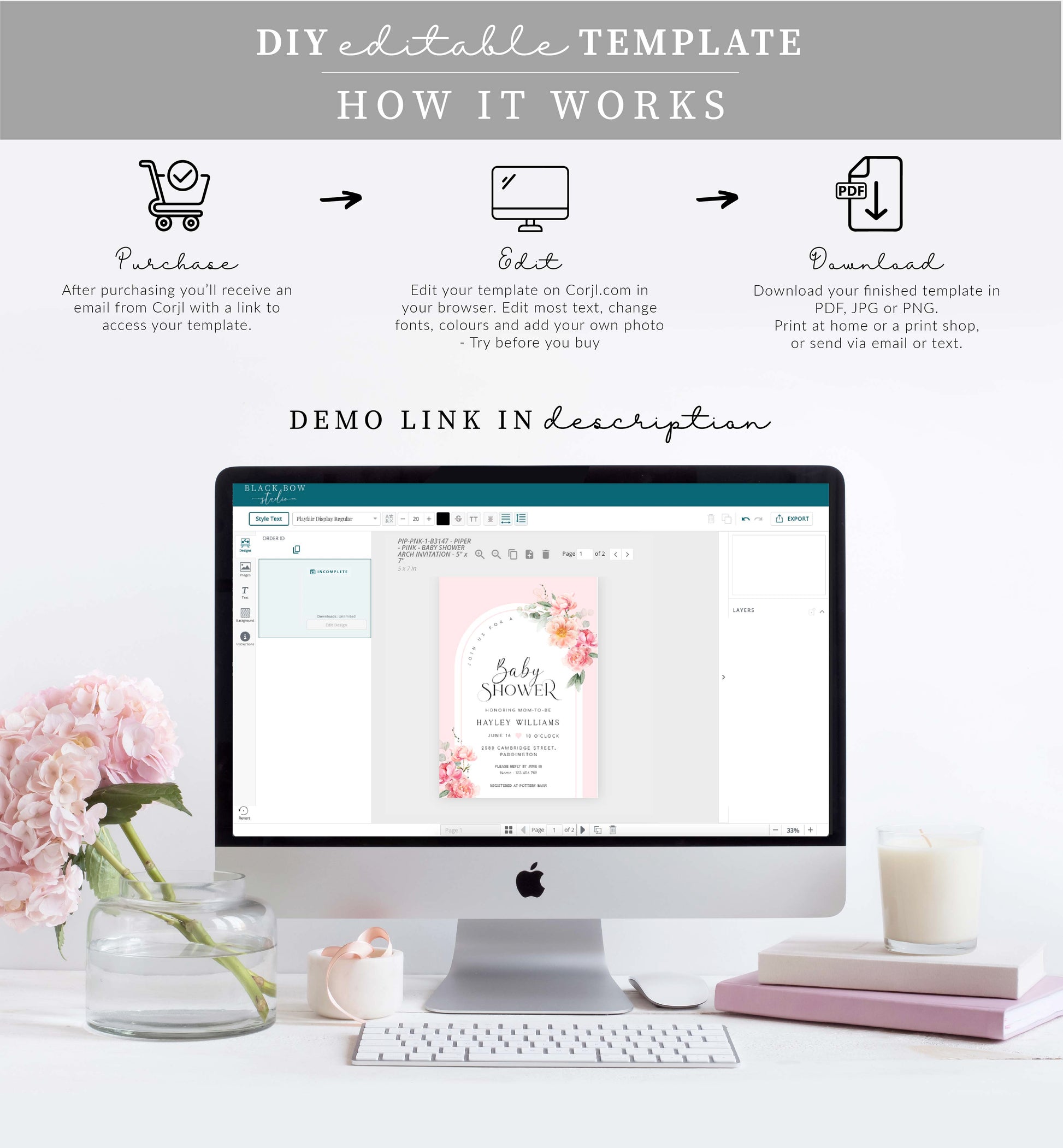 This is a do-it-yourself template editable using corjl.com – an online template editing platform that allows you to personalise your template in your internet browser – No need to install special software or download fonts. The templates are available as soon as your order has been processed.
