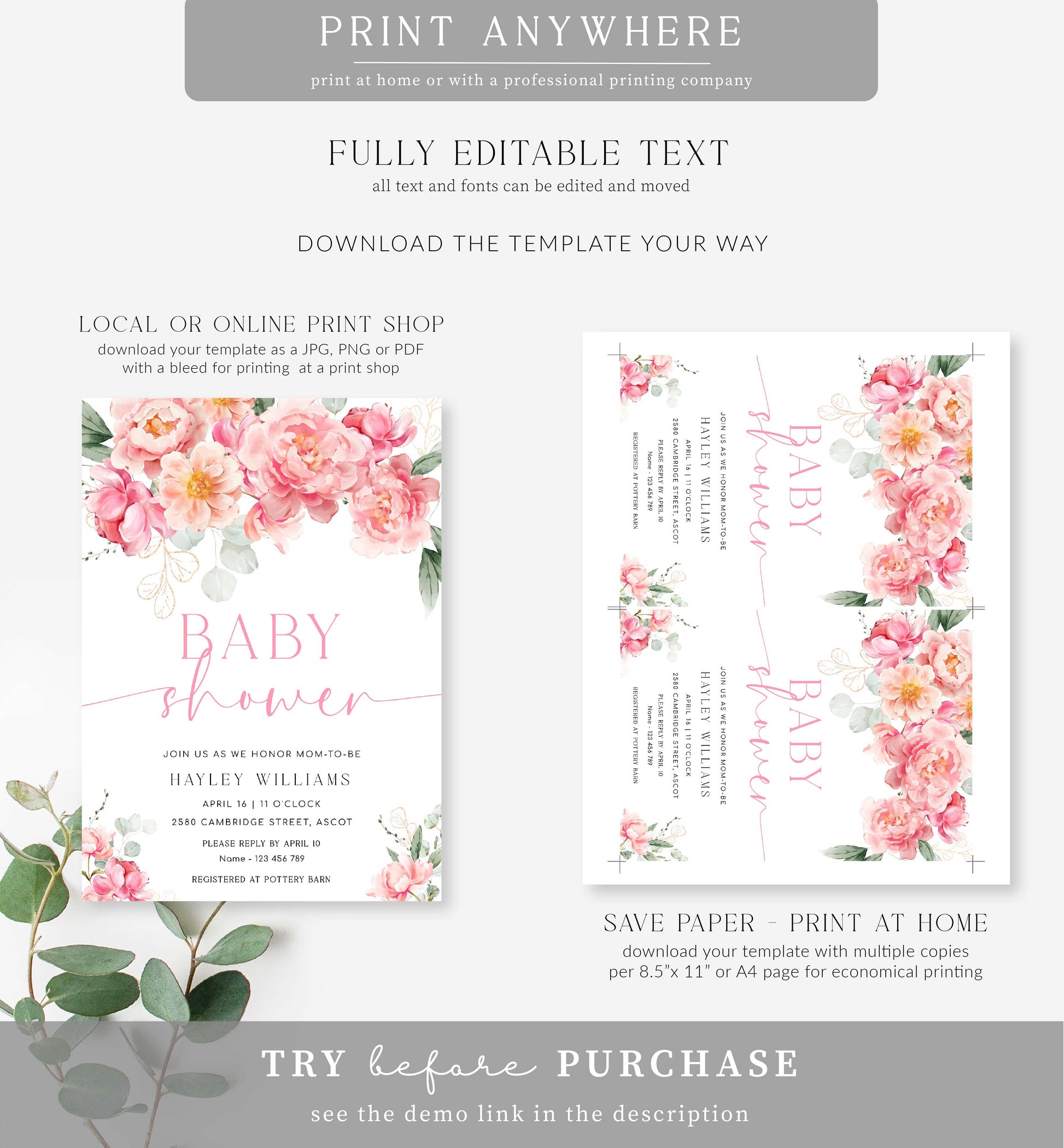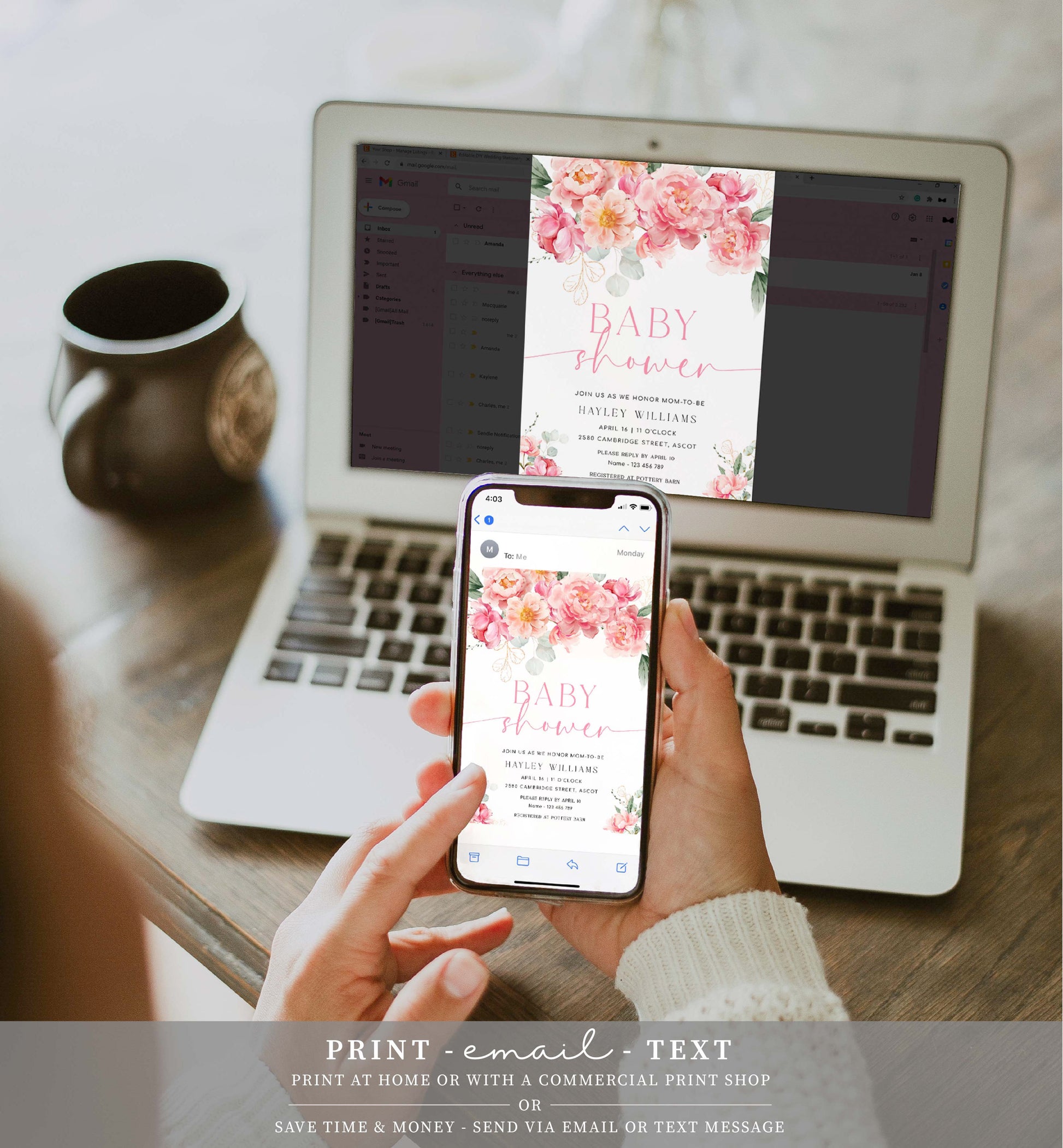 This printable baby shower invitation features a hot pink peony floral design with a modern calligraphy script font. The template has fully editable text that can be customised to suit any event.
