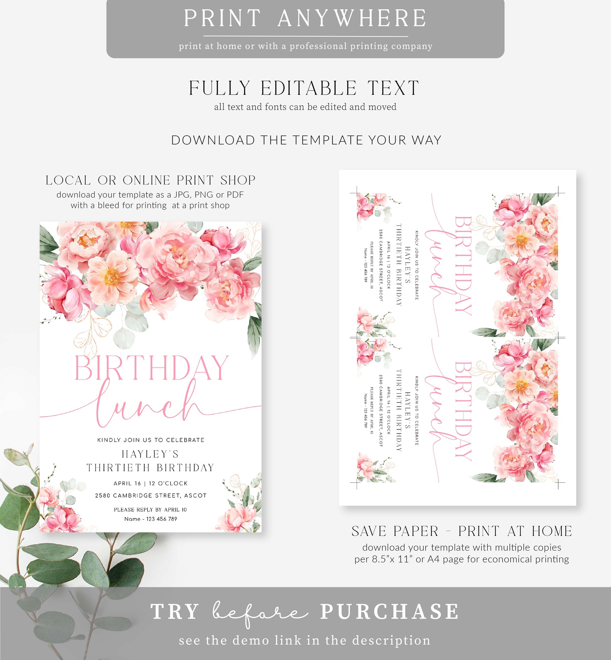 This printable birthday lunch invitation features a blush pink peony floral design with fully editable text and can be customised to suit any event.