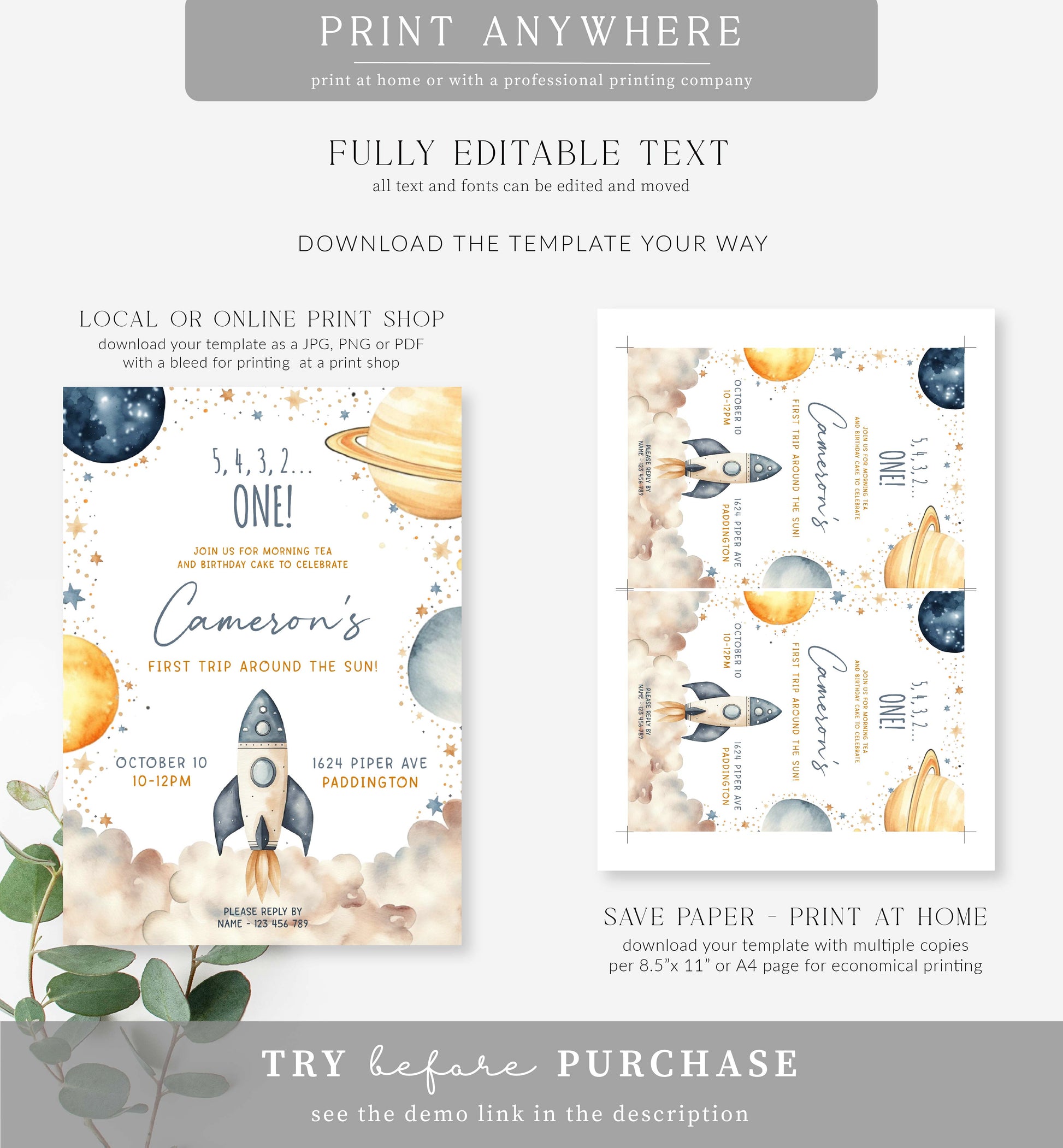 This printable birthday invitation features a first trip around the sun outer space design with hand-painted planets and rocket ship illustrations. All of the text is editable and can be customised to suit any age birthday.