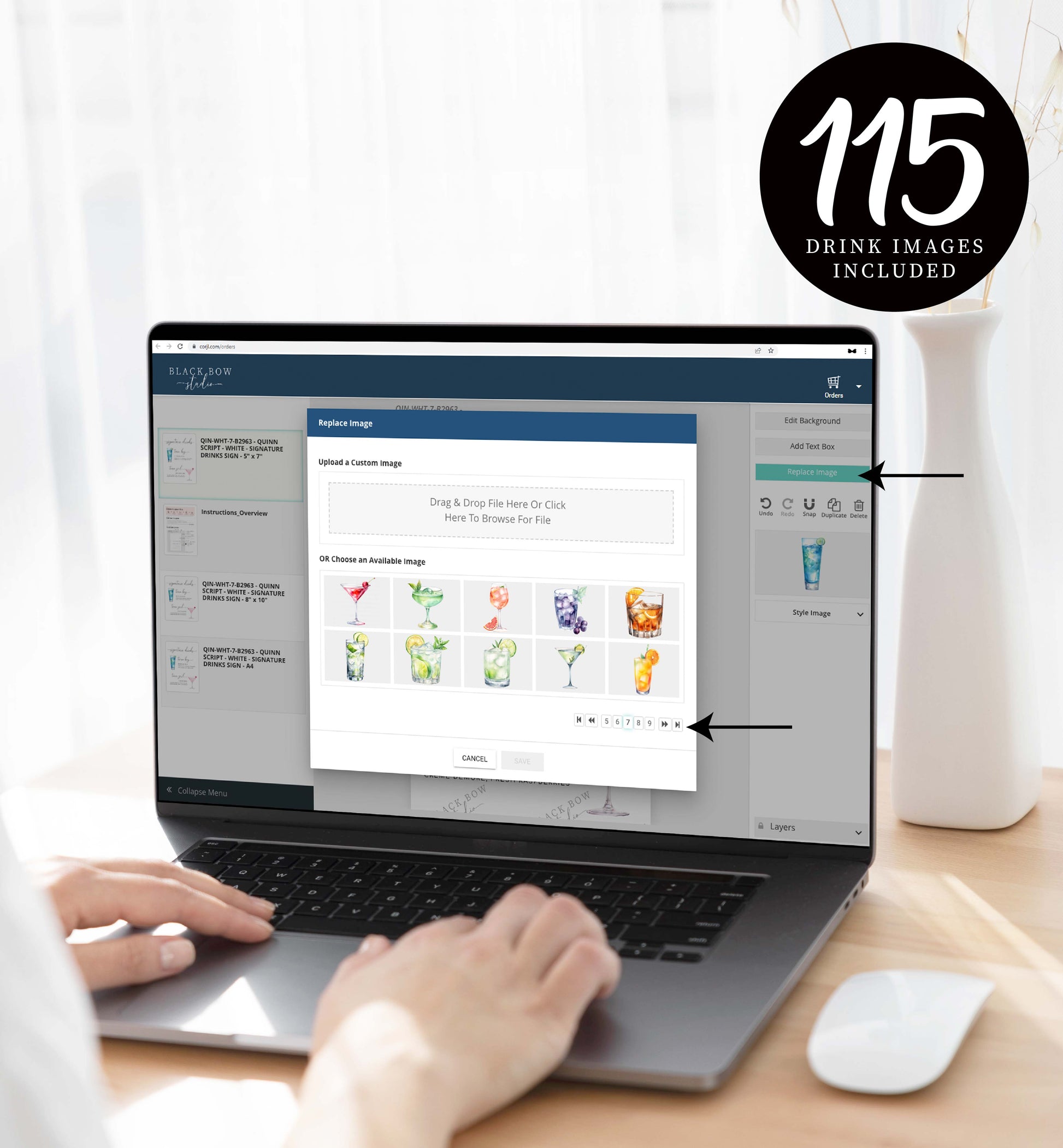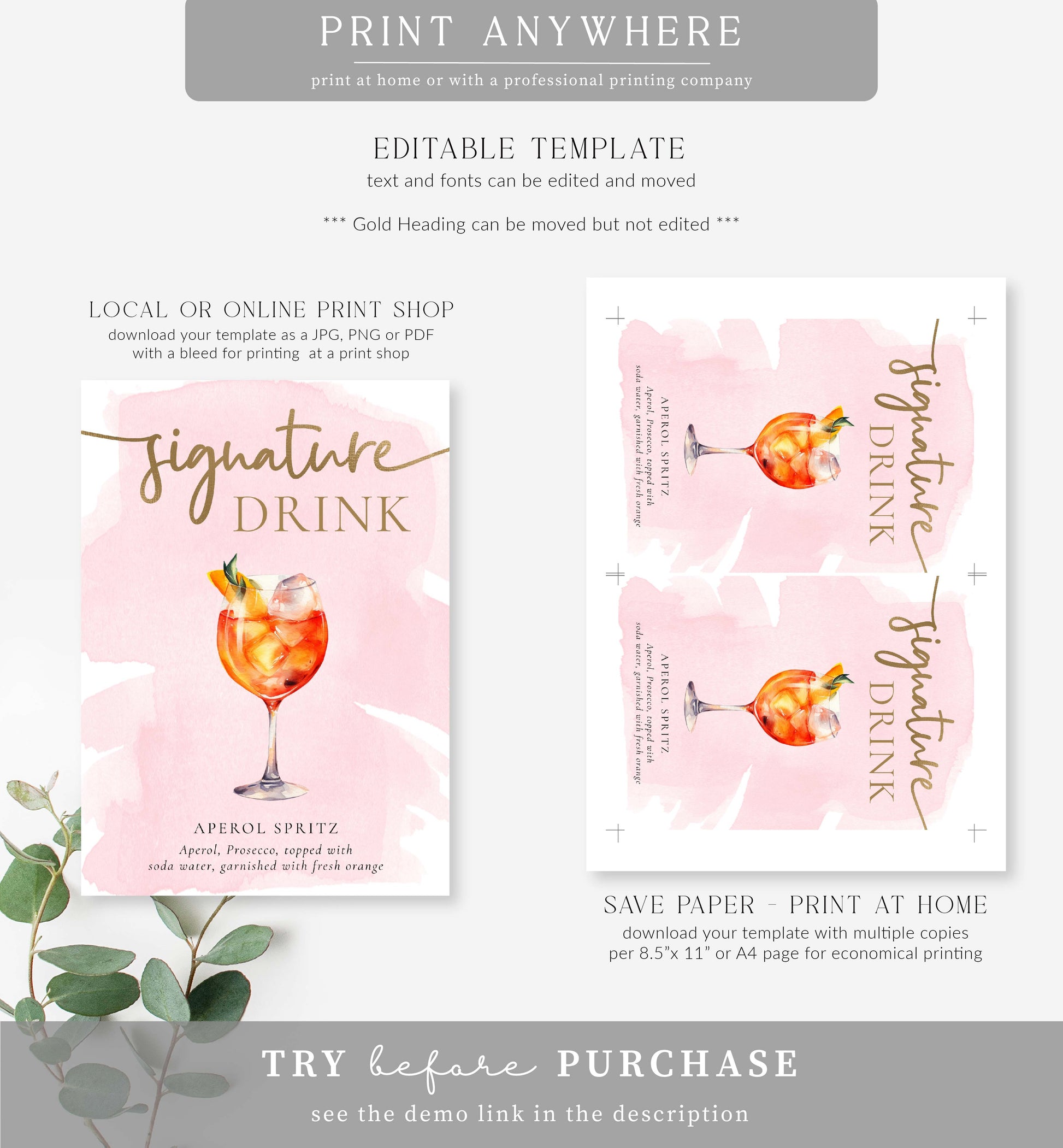This printable signature drink bar menu sign template features fully editable text and over 100 cocktail images.
