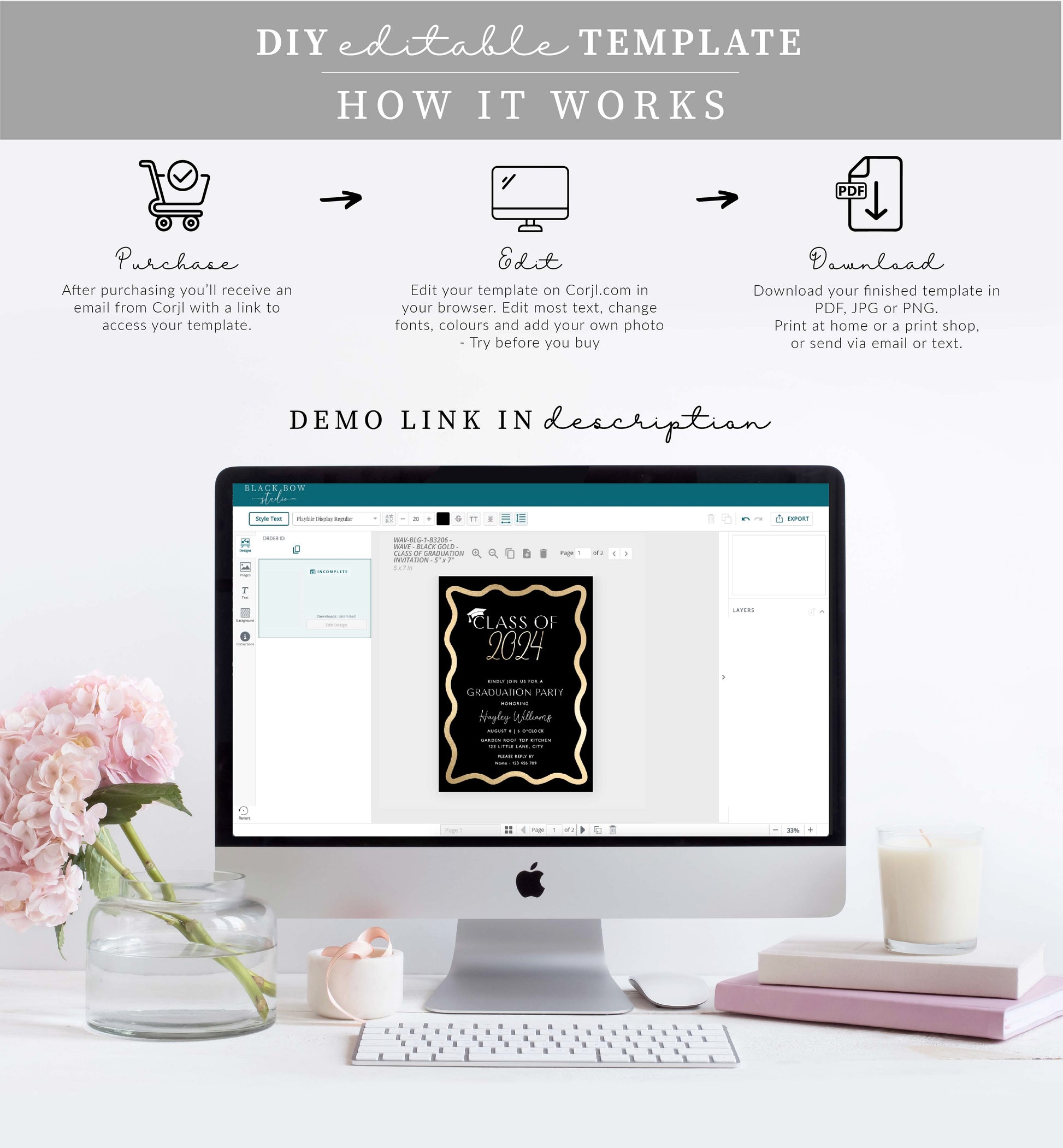 This is a do-it-yourself template editable using corjl.com – an online template editing platform that allows you to personalise your template in your internet browser – No need to install special software or download fonts. The templates are available as soon as your order has been processed.