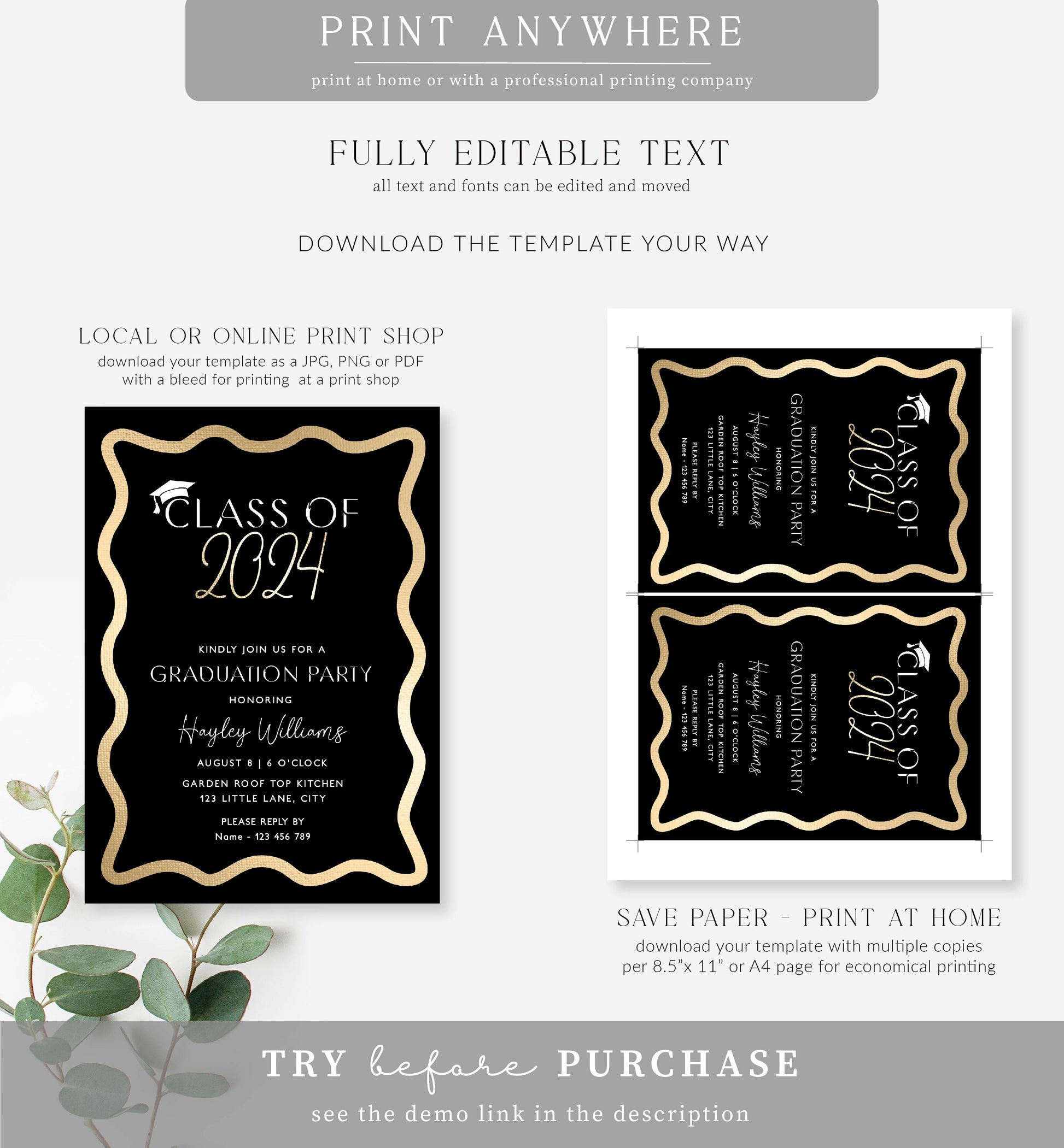 This modern wave line graduation class of 2025 invitation features fully editable text that can be customised to suit any event.