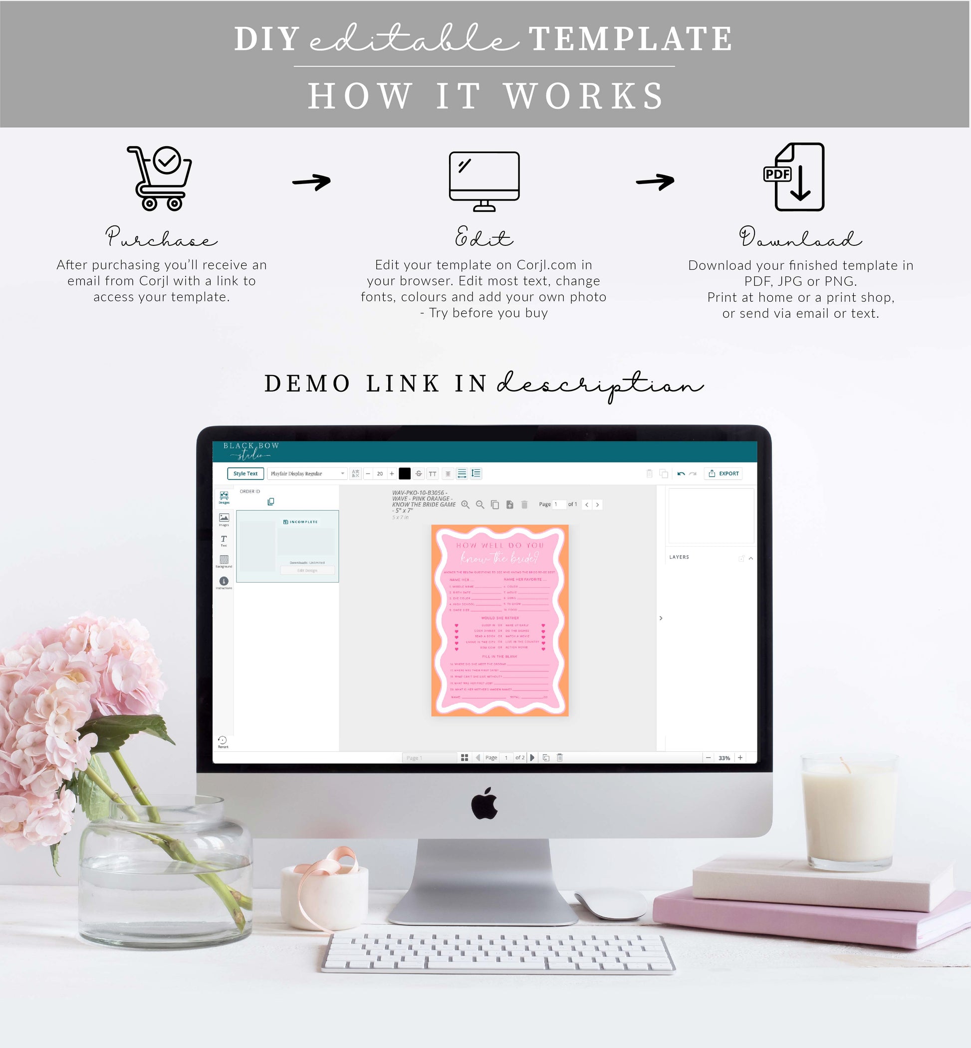This is a do-it-yourself template editable using corjl.com – an online template editing platform that allows you to personalise your template in your internet browser – No need to install special software or download fonts. The templates are available as soon as your order has been processed.