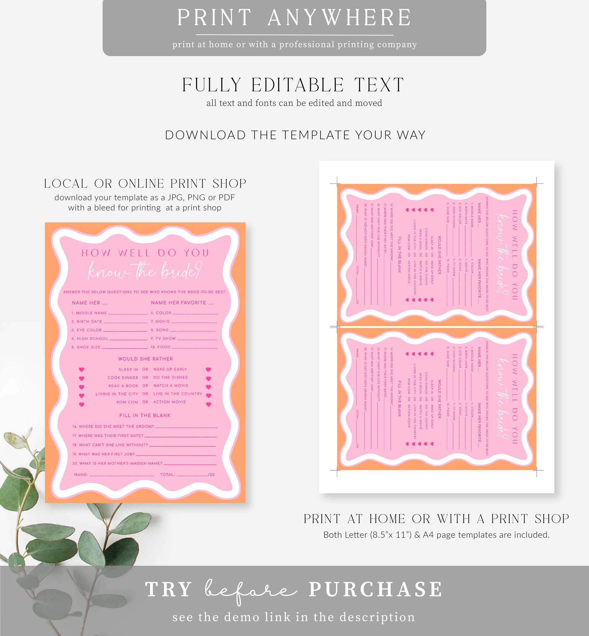 This printable how well do you know the bride game features fully editable text that you can personalise to suit the bride-to-be.